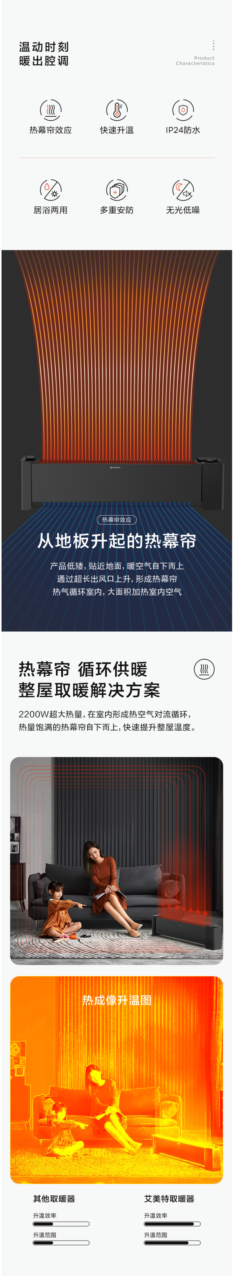 发热时直接加热空气,无光无声无风感,温和升温、均匀舒适,静音不扰人;铝合金机身外壳,时尚美观,防烫,短暂触摸,完全不会有烫伤的情况。