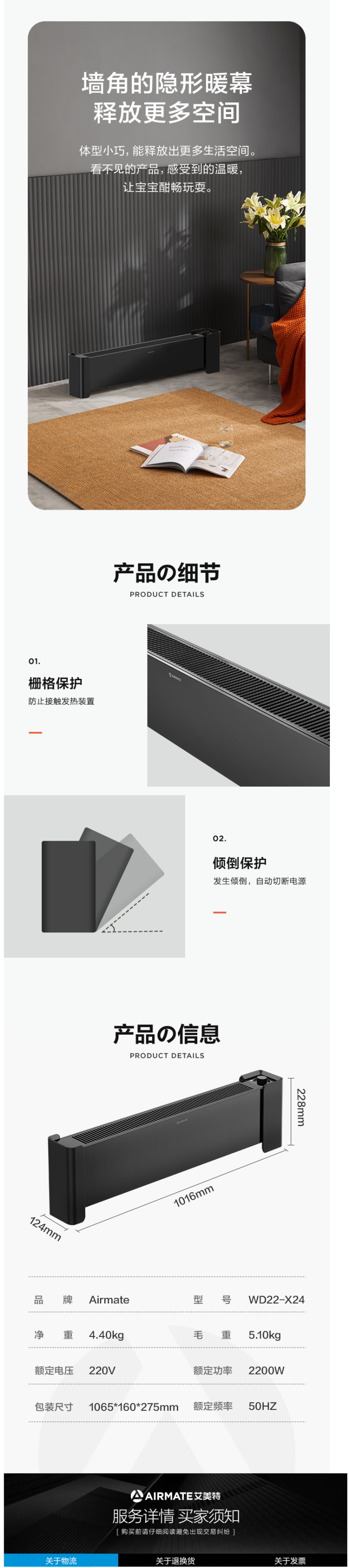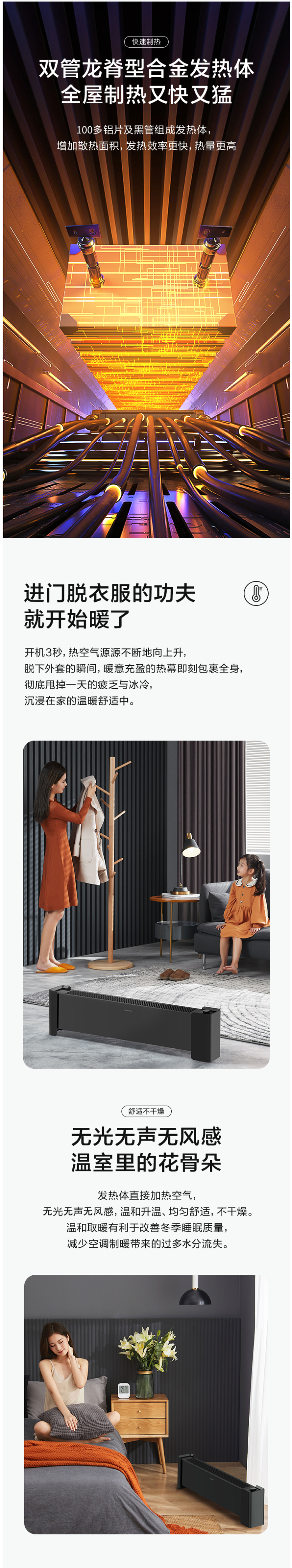 这款艾美特WD22-X24踢脚线电暖气,使用双管龙脊型合金发热体-113片铝片及黑管组成的,增加了散热面积,发热效率更快,热量更高。