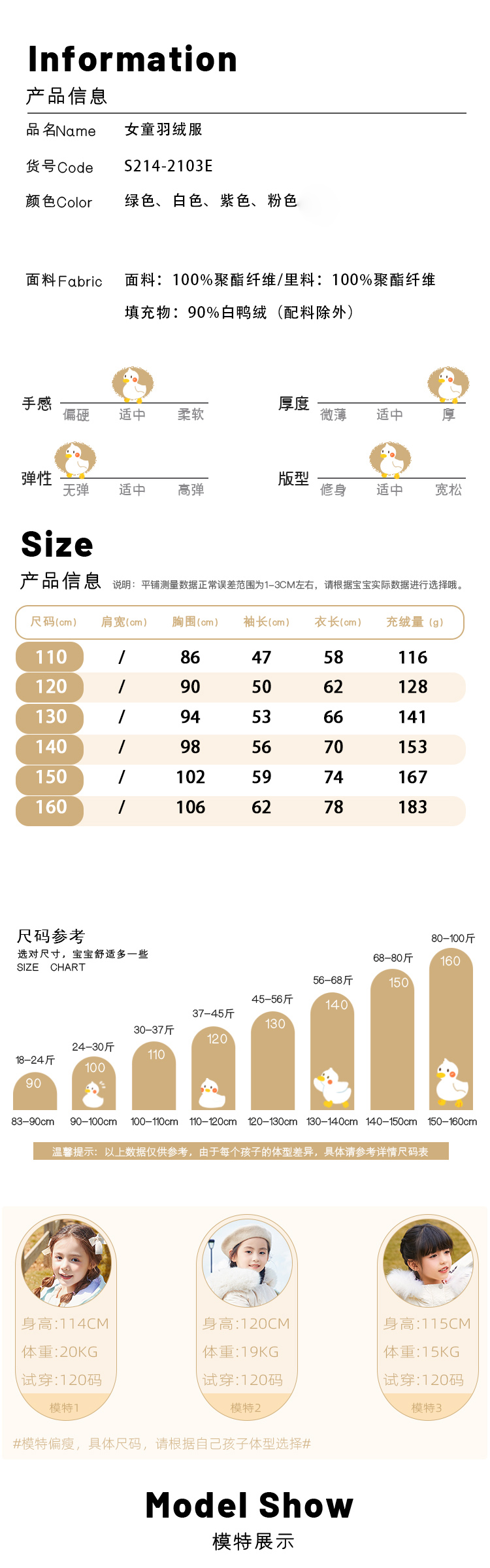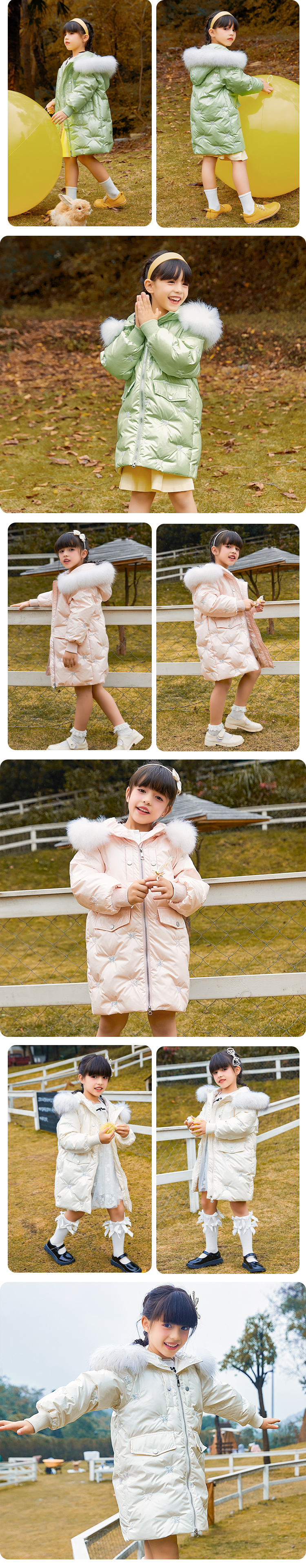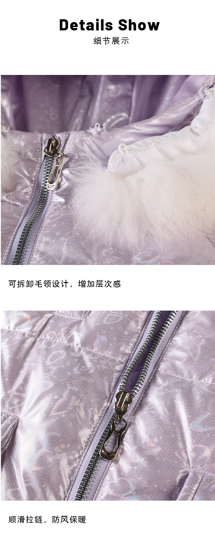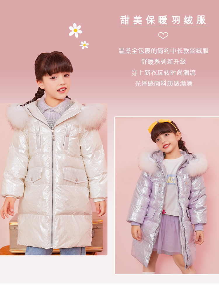 适合身高尺码110-160cm。可爱甜美风设计,内里填充优质90白鸭绒、中厚款式充绒量116-183g,高密面料锁绒、防风、防泼水,厚实大毛领设计,保暖舒适,时尚百搭。
