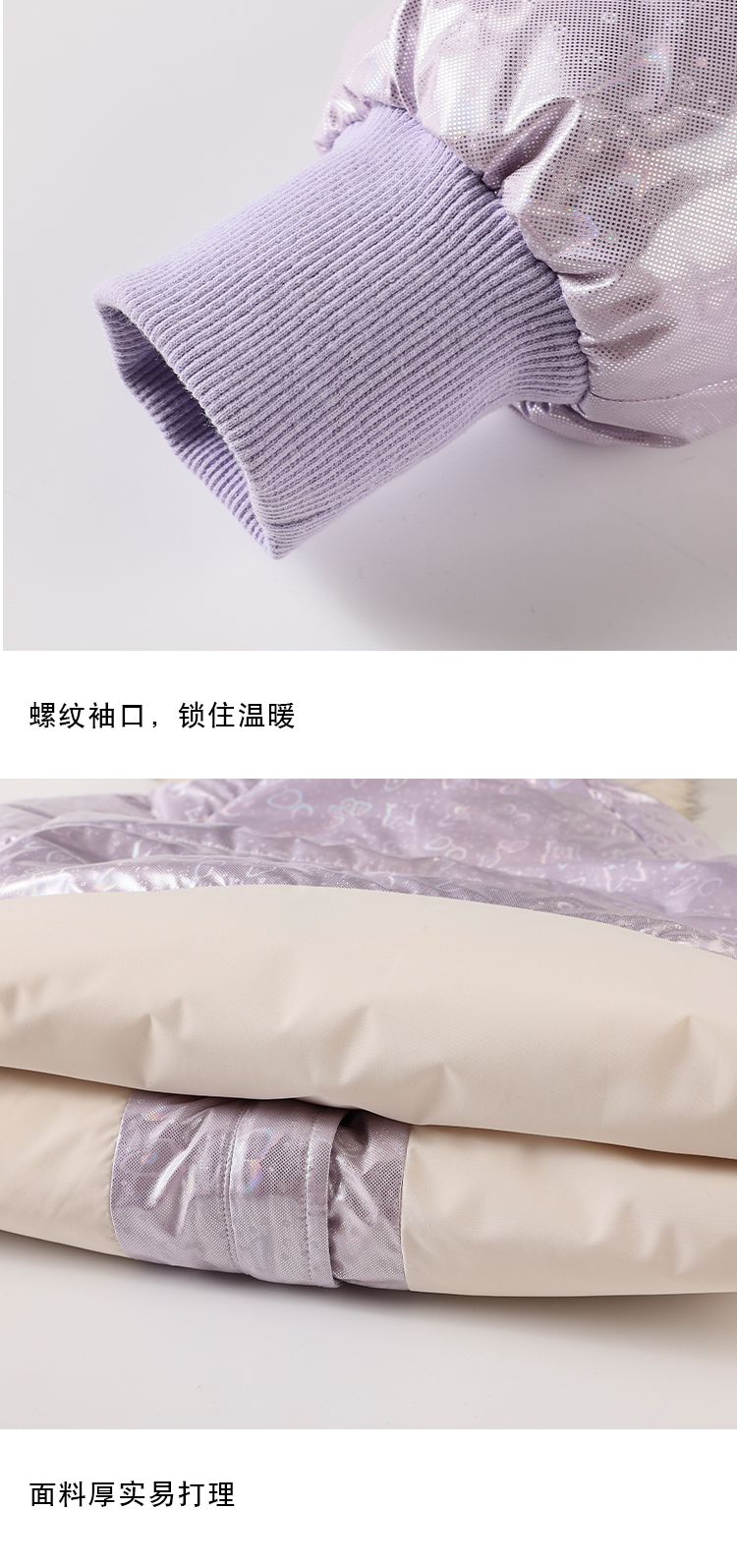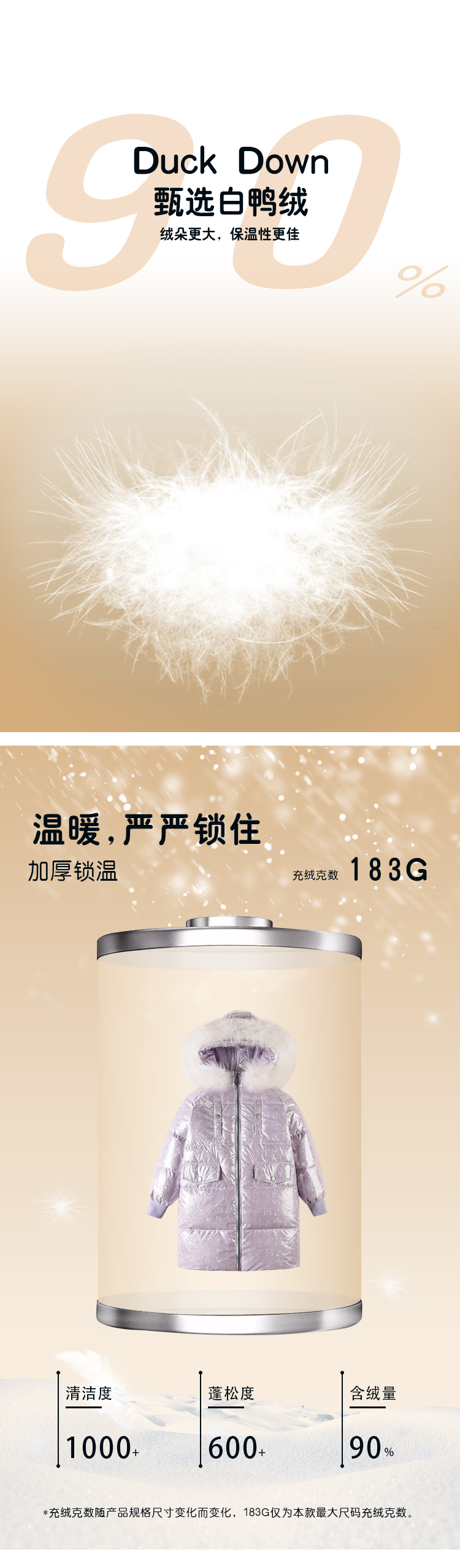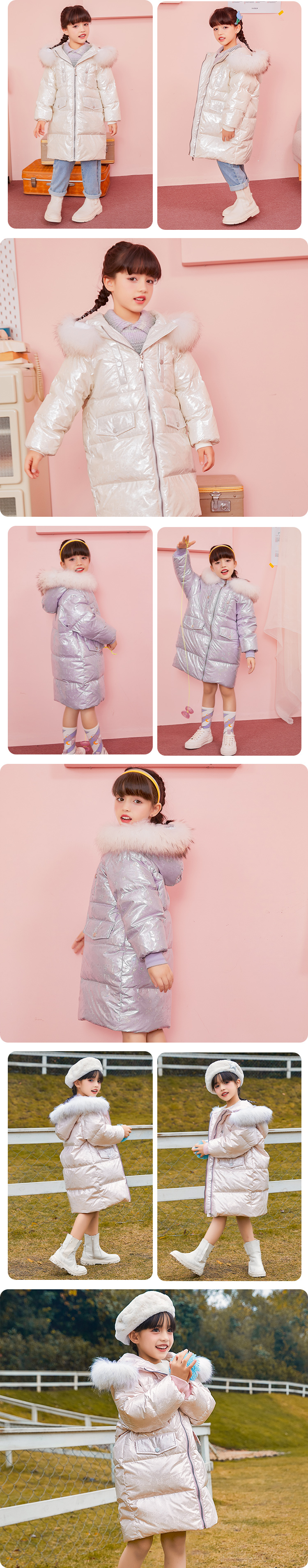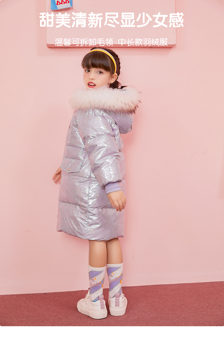 适合身高尺码110-160cm。可爱甜美风设计,内里填充优质90白鸭绒、中厚款式充绒量116-183g,高密面料锁绒、防风、防泼水,厚实大毛领设计,保暖舒适,时尚百搭。