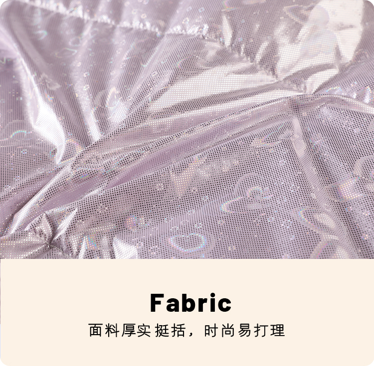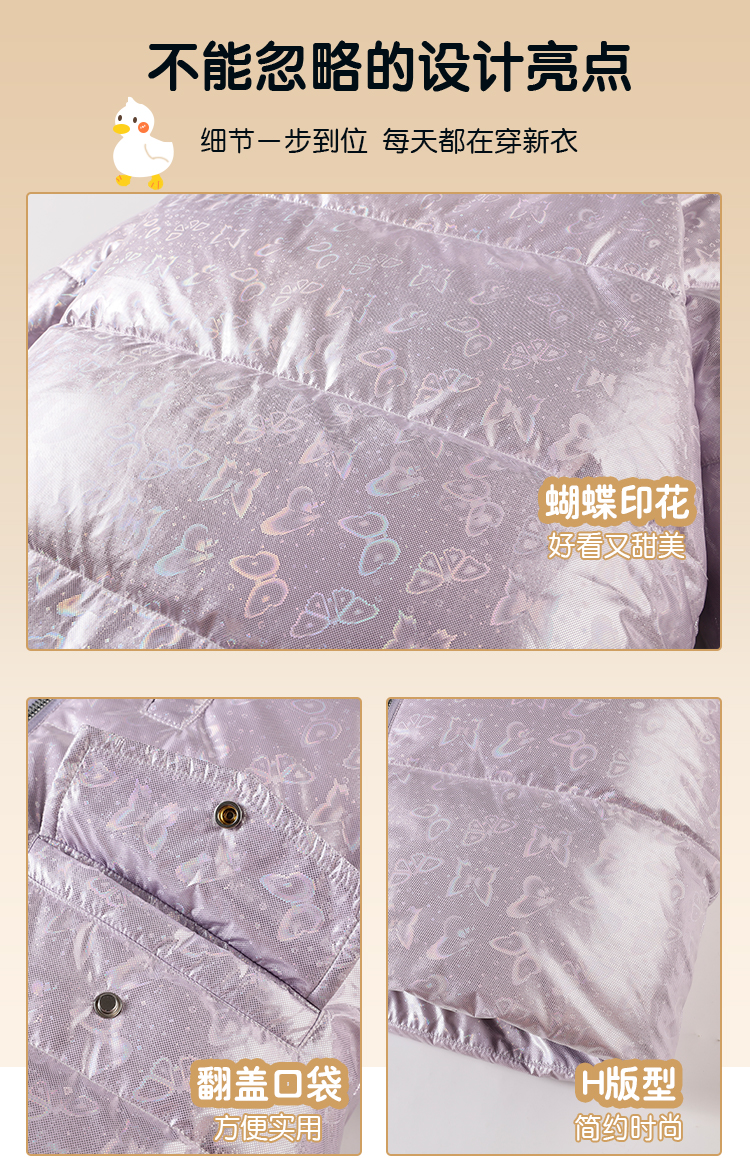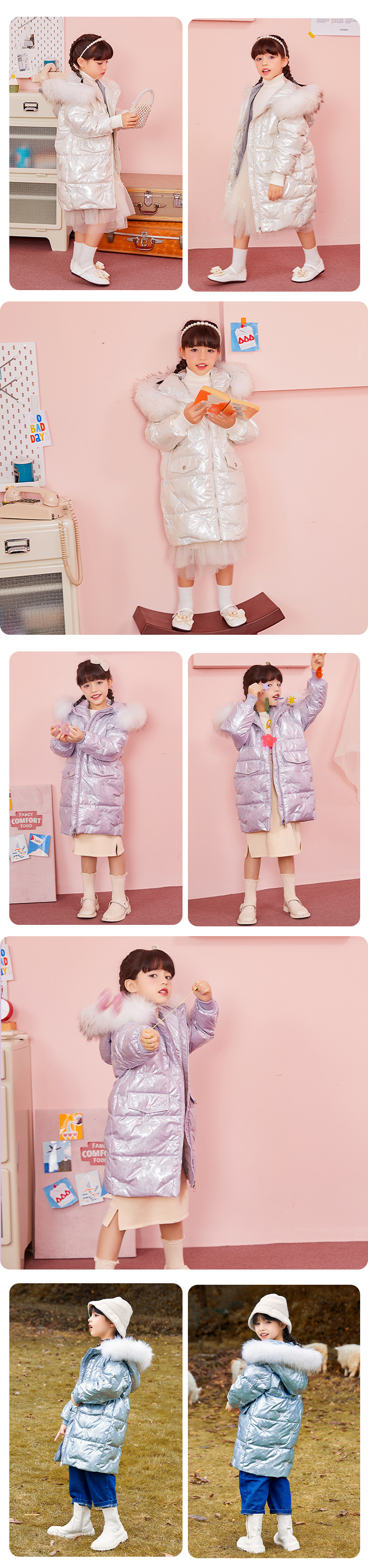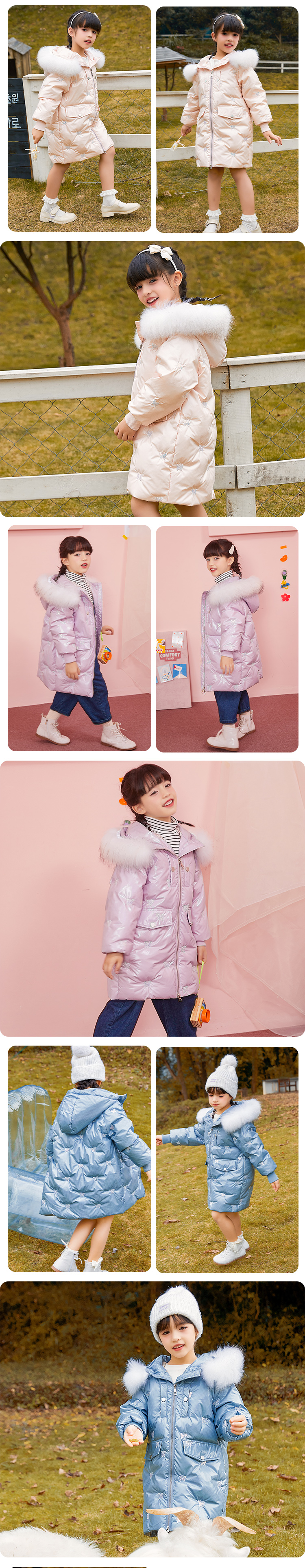 适合身高尺码110-160cm。可爱甜美风设计,内里填充优质90白鸭绒、中厚款式充绒量116-183g,高密面料锁绒、防风、防泼水,厚实大毛领设计,保暖舒适,时尚百搭。