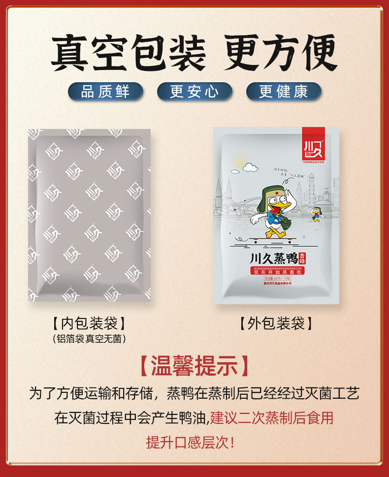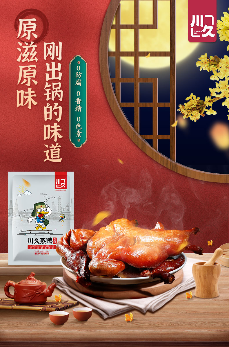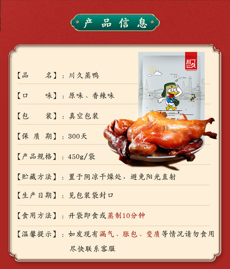重庆川久食品有限公司,2011年成立以来,一直致力于将传统美食产业化、品牌化。先后获得了“重庆市著名商标”,“重庆市龙头企业称号”,“ISO认证”,“2012年重庆市第十一届农交会消费者喜爱产品奖”等。并注册以“川久”,“川久香鸭”,“醉醉旺”,“口水跳”为领导品牌的产品运作发展目标。
