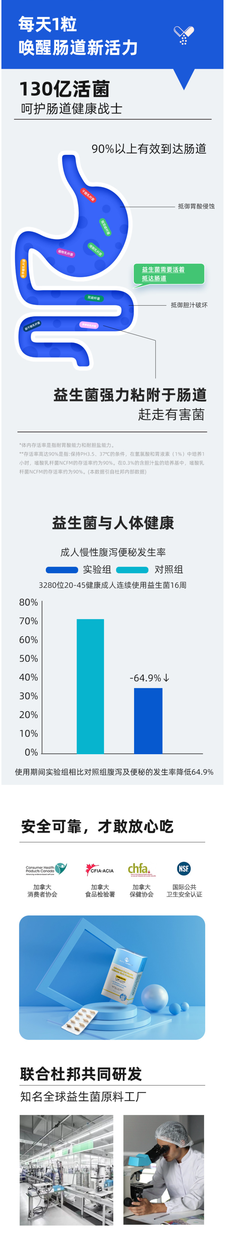 这款益生菌加拿大原装进口,联合杜邦公司共同研发,专为肠道定制,加拿大保健协会、加拿大食品检验署、国际公共卫生认证。