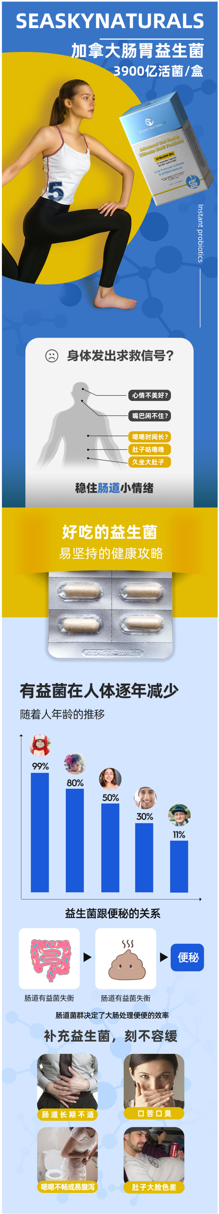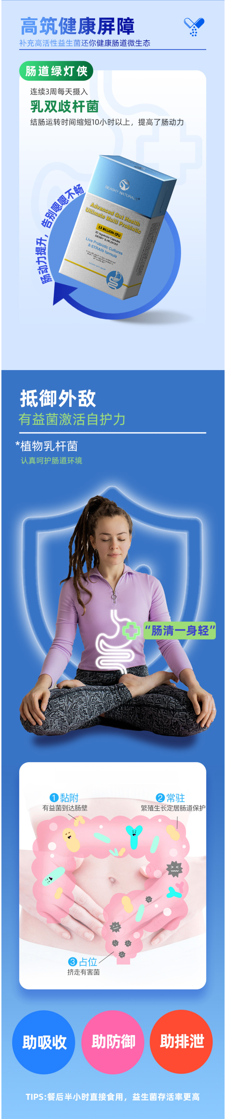 每粒含130亿活性益生菌,隔氧阻光PP袋包装,保持菌株活力,排出宿便,清理毒素,搞定多种肠道问题,唤醒肠道新活力!