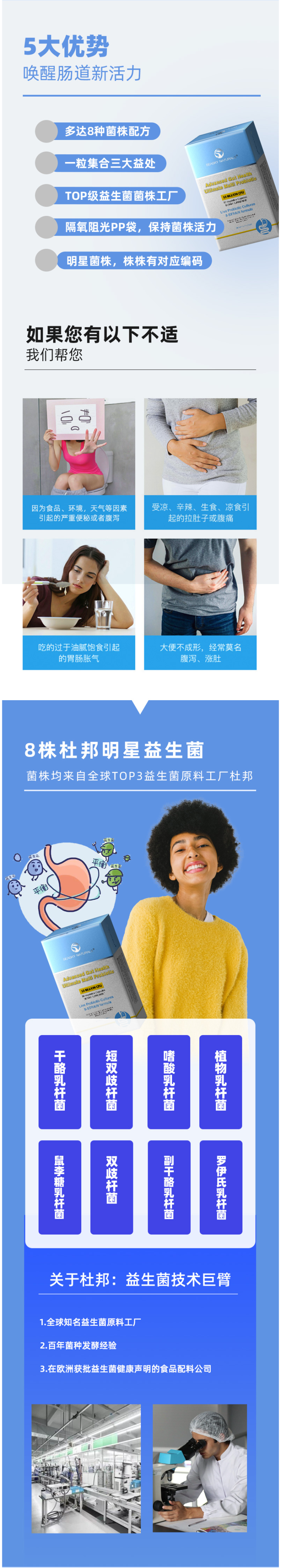 采用8种益生菌复合配方,菌株均由美国杜邦公司生产,包含:嗜酸乳杆菌、双歧杆菌、干酪乳杆菌、嗜酸乳杆菌、植物乳杆菌、鼠李糖乳杆菌、副干酪乳杆菌、罗伊氏乳杆菌。