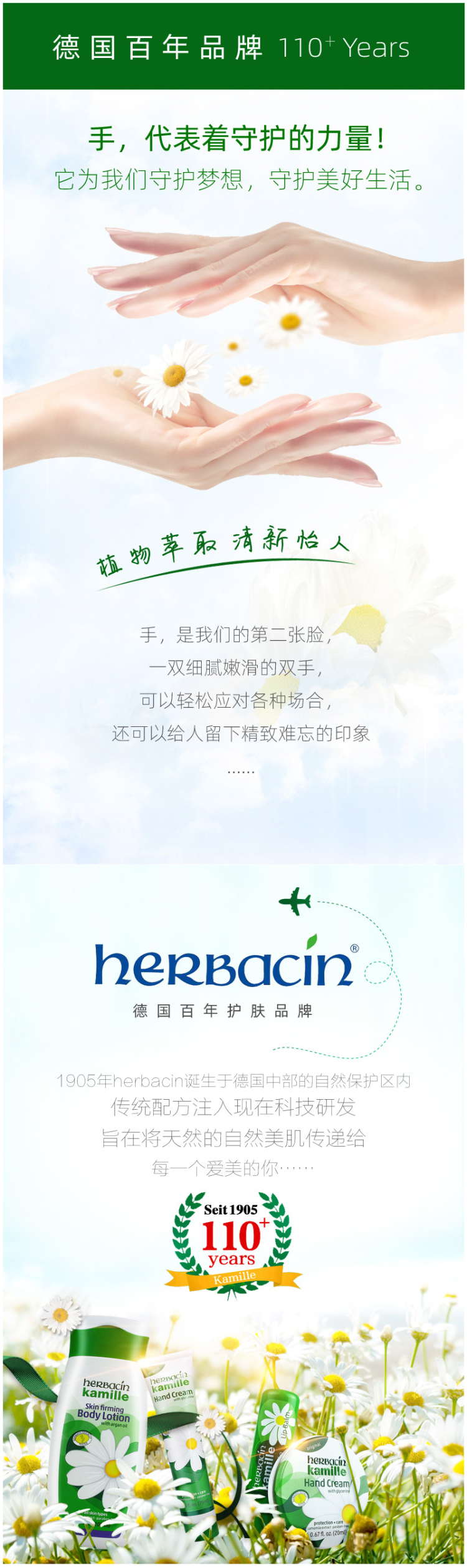 德国小甘菊herbacin「官网链接」,于1905年创立于德国中部,是德国的经典护肤品牌之一。herbacin的产品原料都是选择最高品质的植物萃取,再以最严谨的德国制造流程,依传统配方制造产品,使其不但成为了德国的经典品牌,也成为了欧洲人手一款的经典护肤品牌。