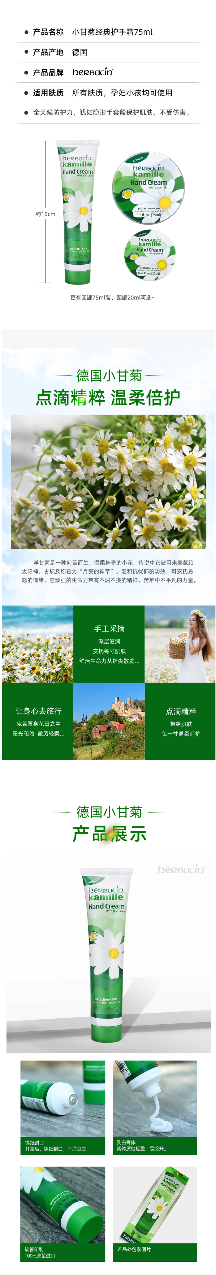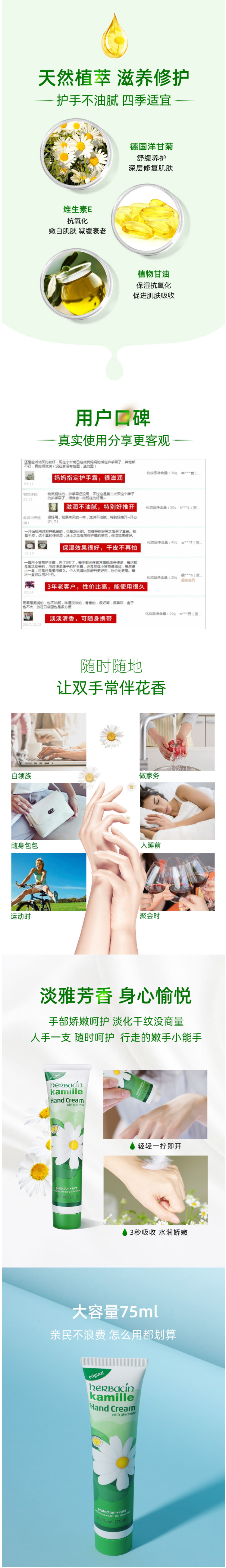 这款小甘菊 补水滋润手足霜,德国原装进口,采用德国洋甘菊萃取精华和荷荷巴油,能软化角质深入修护肌肤,补水持久保湿,洋甘菊精华能舒缓秋冬敏感肌。