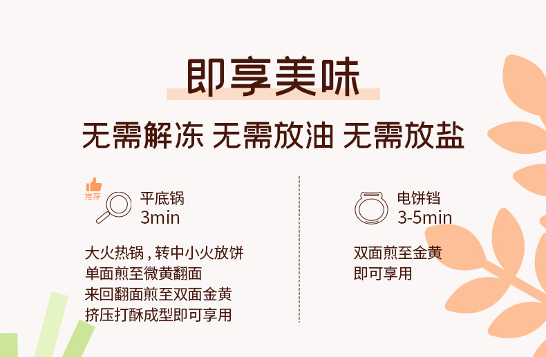 这款粮全其美原味手抓饼,每片手抓饼重约100g,使用非转基因大豆油,优质面粉,配以鲜美香葱制作而成。使用时,无需额外添加油盐,3分钟即可完成制作,色泽金黄,松脆可口,能够随意和其他食材搭配,营养丰富,老少皆宜。