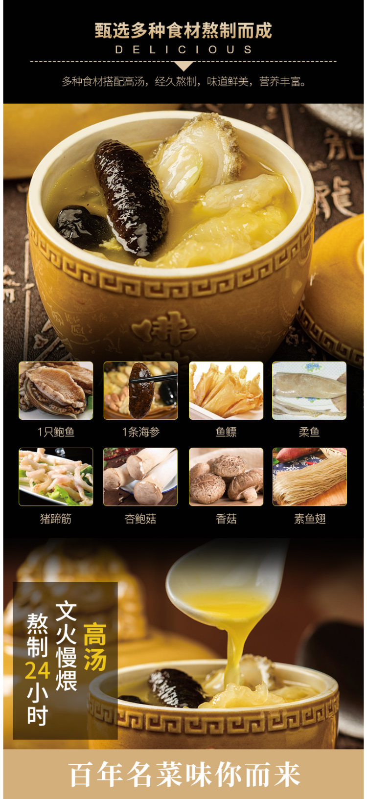 这款佛跳墙是单人份,包含1只鲍鱼、1条海参、鱼鳔、柔鱼、猪蹄筋、香菇、杏鲍菇、素鱼翅等高端食材。谨遵古法高汤熬制,配以土鸡、鸭肉、猪肉等多种食材交替分层煨制24个小时,汤底富胶质,香浓艳滑,味道醇厚。不含任何防腐剂成分。买回家加热即食即可,非常方便。