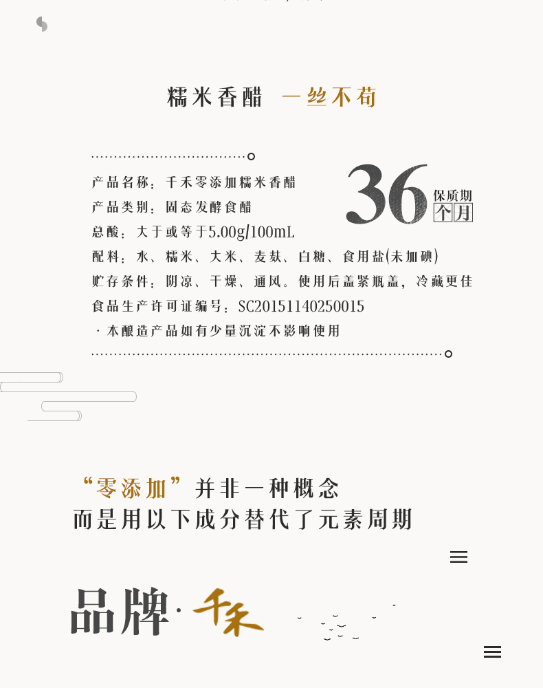 千禾是国内知名调味品食品品牌。此款为千禾 零添加糯米香醋,非转基因原料纯粮酿造,原味原香零添加,固态发酵,总酸≥5g/100ml,口味纯正,微甜鲜爽,适合炒菜、凉拌、饺子蘸料。规格为1L/瓶。