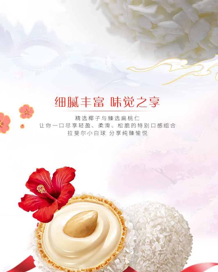 拉斐尔是意大利费列罗集团旗下品牌之一,这款是拉斐尔的棷蓉扁桃仁糖果酥球。白巧克力外裹着密密的一层椰蓉,里面包着香甜的果酱和扁桃仁。夹着果仁的巧克力外衣脆脆的,香浓四溢,里面巧克力心柔软浓滑,甜而不腻入口即化。