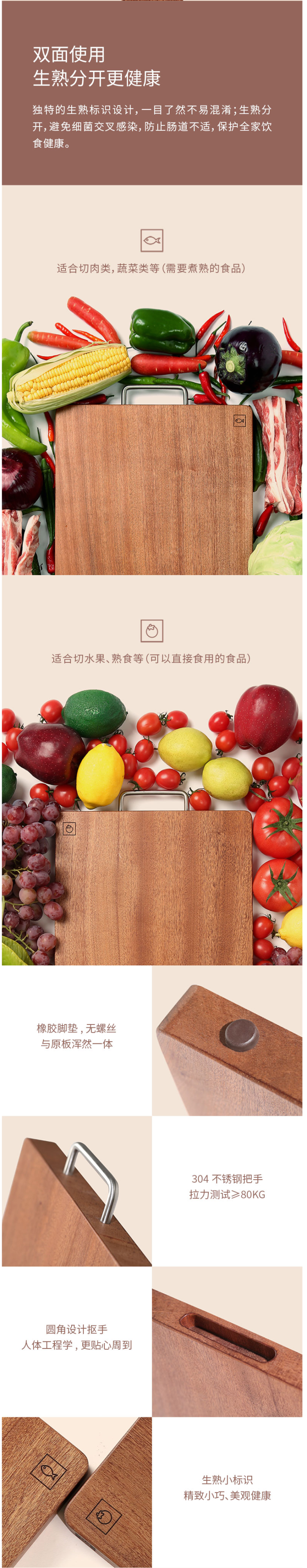 砧板加厚2.5cm,经过高温脱脂烘干技术,将木材的含水率降到8%-12%,使空气中的含水率相平衡,久用不掉色、不开裂、不变形,表面上了一层食品级矿物油,能有效养护砧板。