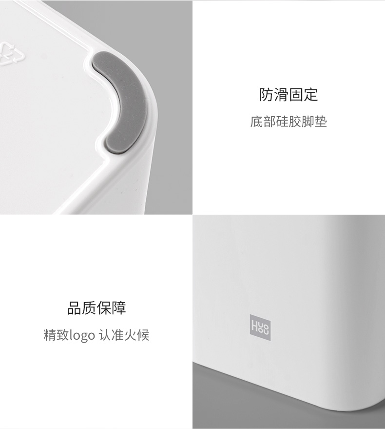 顶盖可以拔出,跟桶身分别单独清洗。底部有两个漏水孔,防止发霉。四角有硅胶防滑垫,稳固不易摇晃。