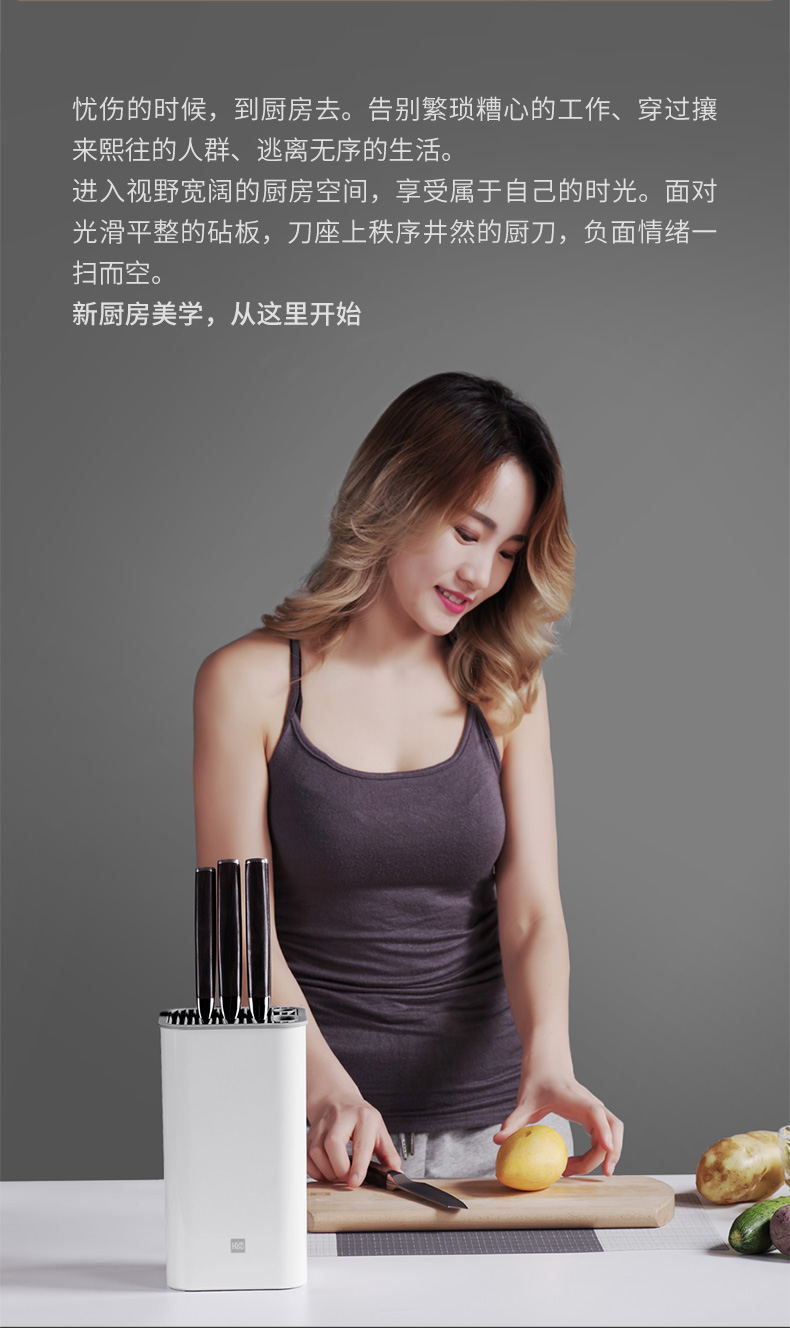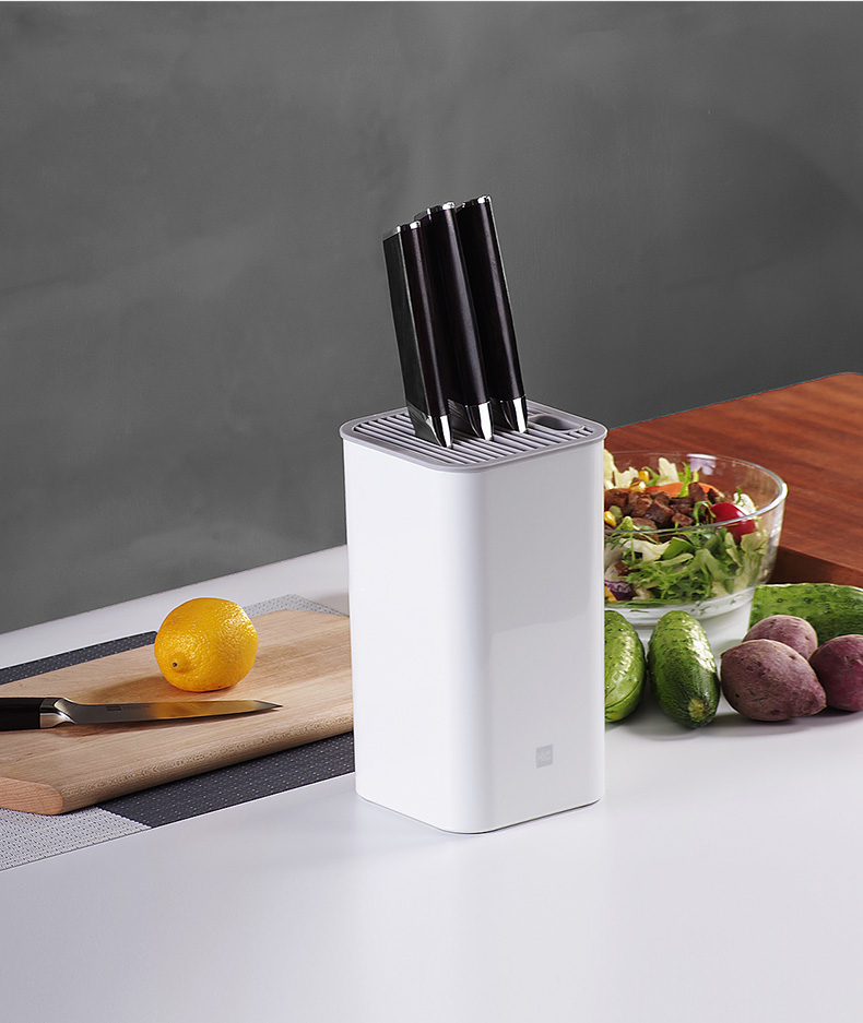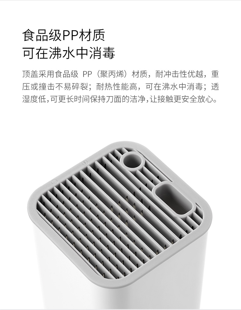 这款火候万用刀具收纳架,顶盖采用食品级PP材质,耐冲击性优越,重压或撞击不易破碎;耐热性能高,可在沸水中消毒;透湿度低,可更长时间保持刀面的洁净,减少细菌的滋生。