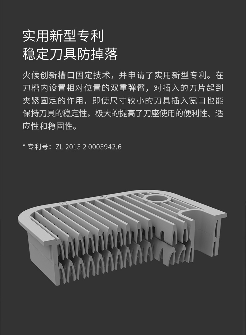 创新槽口固定技术,并申请了实用新型专利。在刀槽内设置相对应的双重弹臂,对插入的刀片起到夹紧固定的作用,即使是尺寸较小的刀具插入宽口也能保持刀具的稳定性。