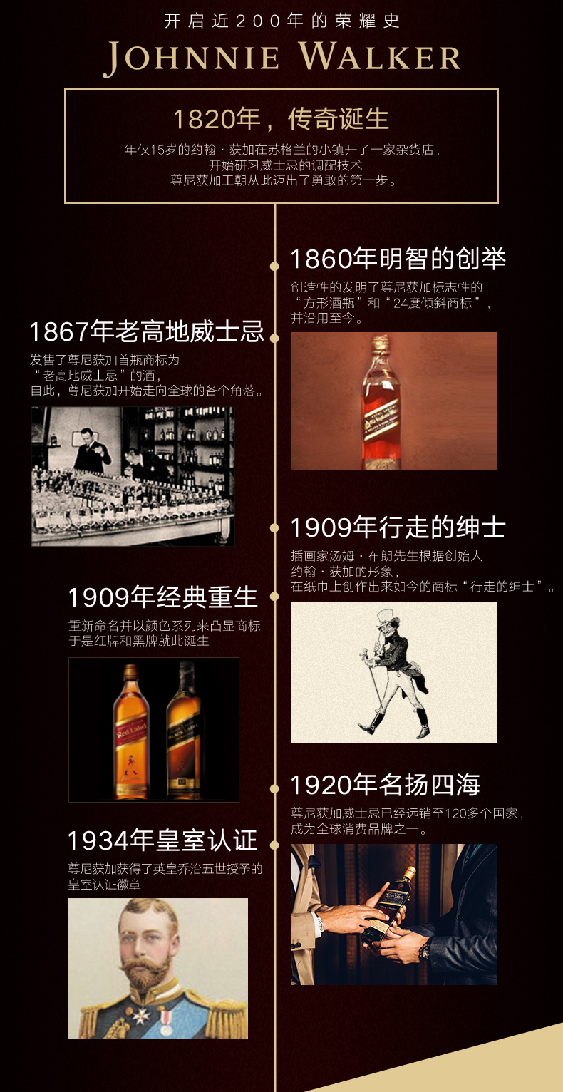 尊尼获加,前些年又译为“约翰走路”,商标就是一个走路的绅士,拥有200年历史,是全球最大的苏格兰威士忌品牌,英国皇室认证威士忌酒。在西方,尊尼尊尼获加就是“茅台”的地位,曾经多年稳居全球烈酒品牌价值第一,但在2018年开始相继被茅台和五粮液超越。
