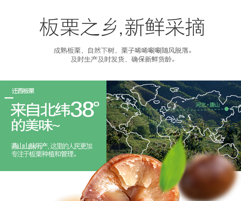 迁西板栗又称京东板栗,产于河北省唐山市迁西县一带,是河北省传统特色农产品,至今有2000多年的栽培历史,在很多古籍上都有记载。迁西板栗外形玲珑,呈红褐色,有浅薄蜡质层,鲜艳而富有光泽;果仁呈米黄色,内皮易剥,肉质细腻,糯性粘软,甘甜芳香,营养丰富。2008年3月,迁西板栗被国家工商总局商标局认定为中国驰名商标。