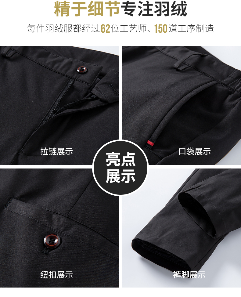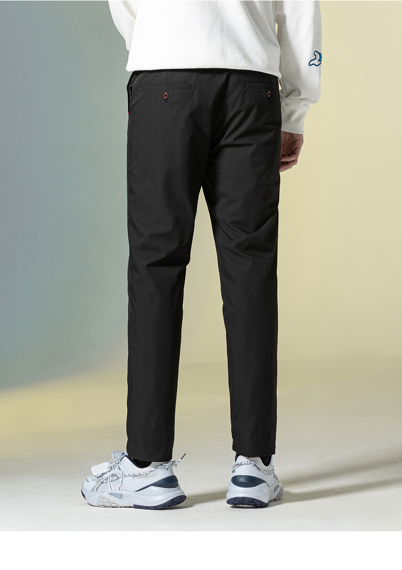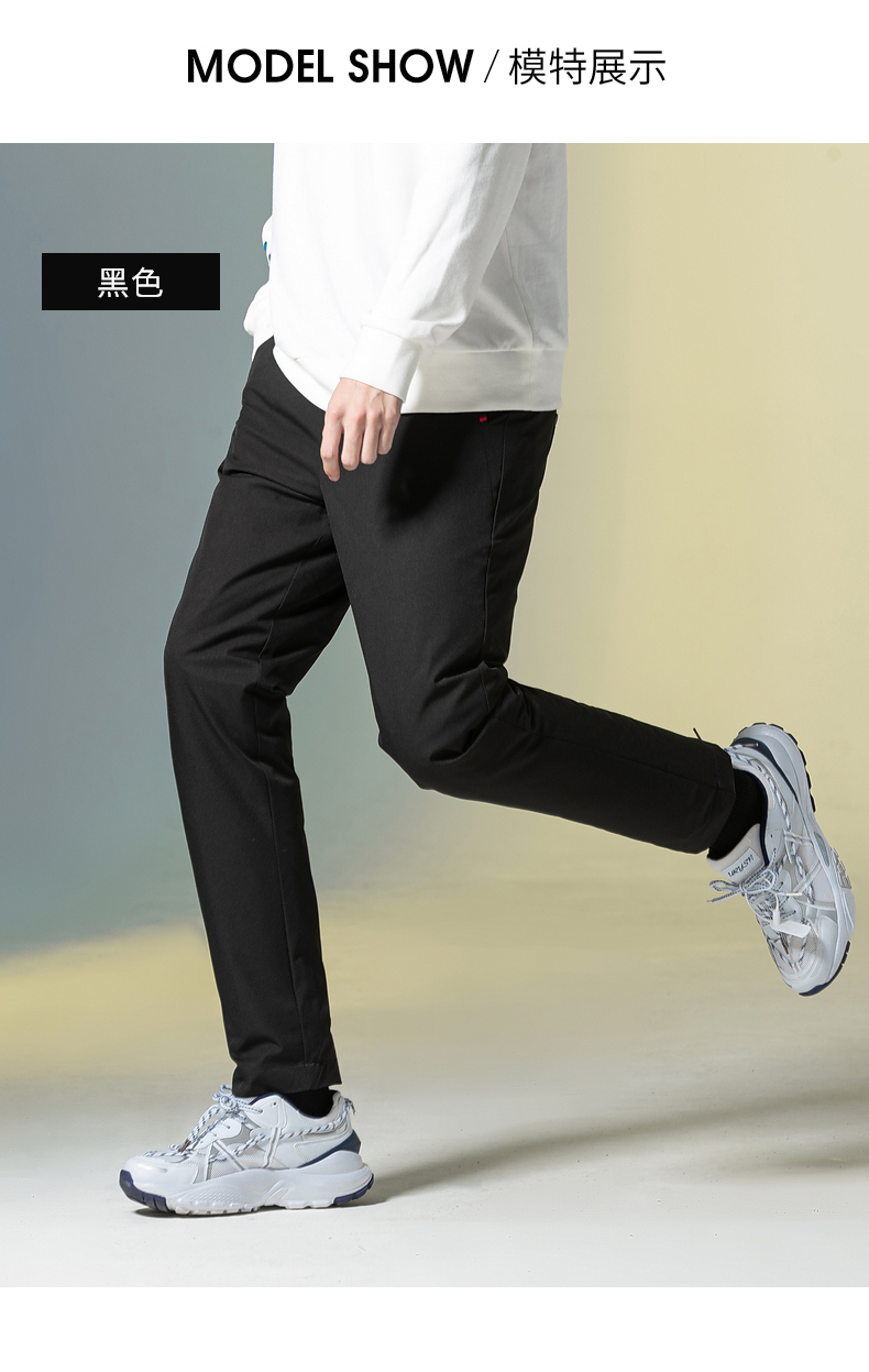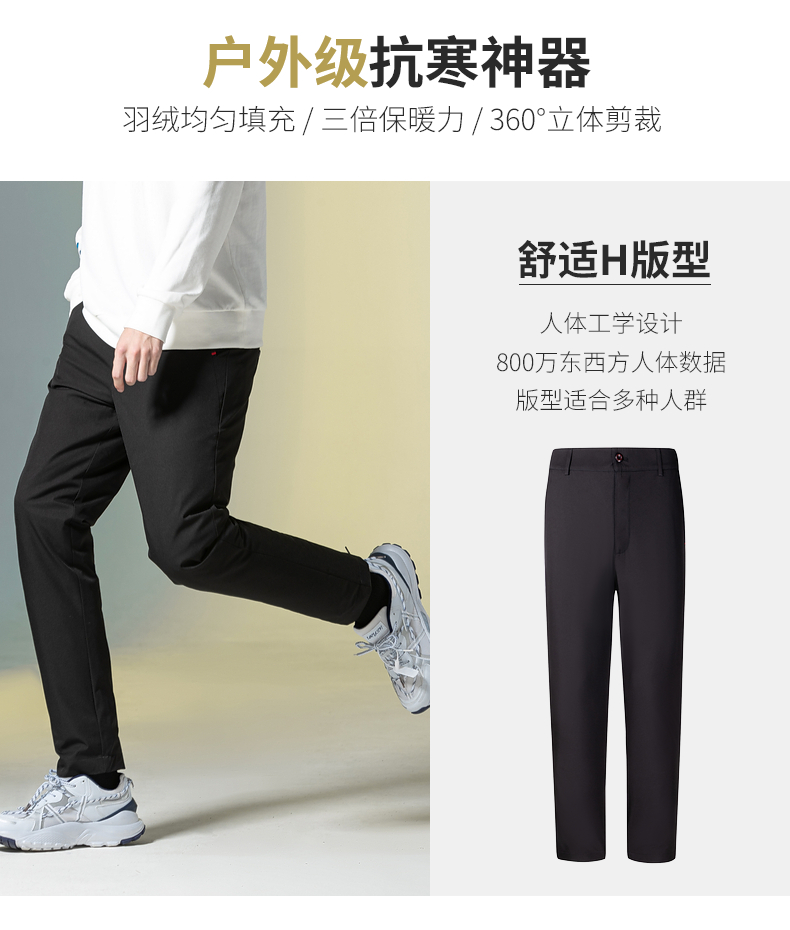 鸭鸭 男士 羽绒裤,高密面料结实耐磨、防风防泼水,填充优质大绒朵白鸭绒,90%含绒量,绒朵严格水洗、高温杀菌,650+高清洁度,蓬松洁净无异味。四层锁绒技术,内胆高支高密、不钻绒、不结团,科学分格填充,分布均匀,上身不臃肿,合体H版型,穿着合体上身不臃肿,日常商务、休闲都可穿。