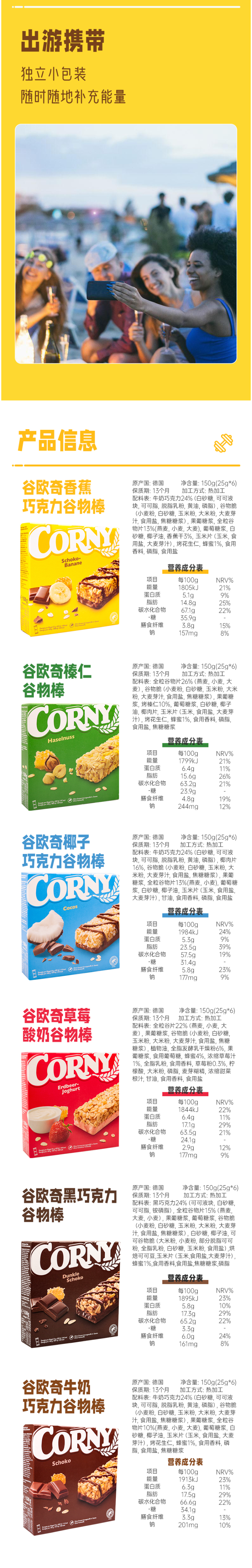 口味:牛奶巧克力谷物棒 150g榛仁谷物棒 150g香蕉巧克力谷物棒 150g草莓酸奶味谷物棒 150g黑巧克力谷物棒 138g椰子巧克力谷物棒 150g