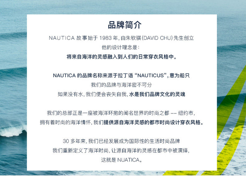 诺帝卡Nautica是美国品牌,成立于1983年,创始人是朱钦骐,国际大牌中少见的华裔设计师。Nautica品牌名源自拉丁文航海用语“Nauticus”,以男装外套起家,航海气息的设计风格,高质量的面料和做工,成为是不少白领的选择,曾经在美国各大商场占据明显位置。