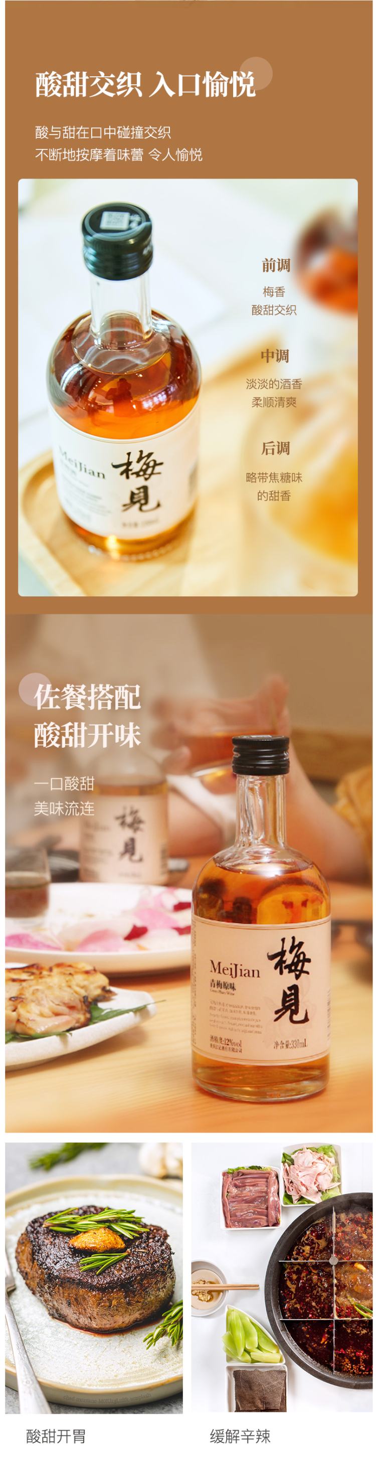 酿制方面:采用国家地理标志认证的普宁青梅,精选过大肉厚青梅,遵循传统工艺,采摘后72小时内糖渍工艺处理,历经90天缓慢出汁,保留纯粹青梅滋味。选用单一高粱酿造的高粱酒作为基酒跟其他白酒比起来口感更纯净,杂味更少,能更好的跟青梅融合,达到酸甜平衡没有杂味。