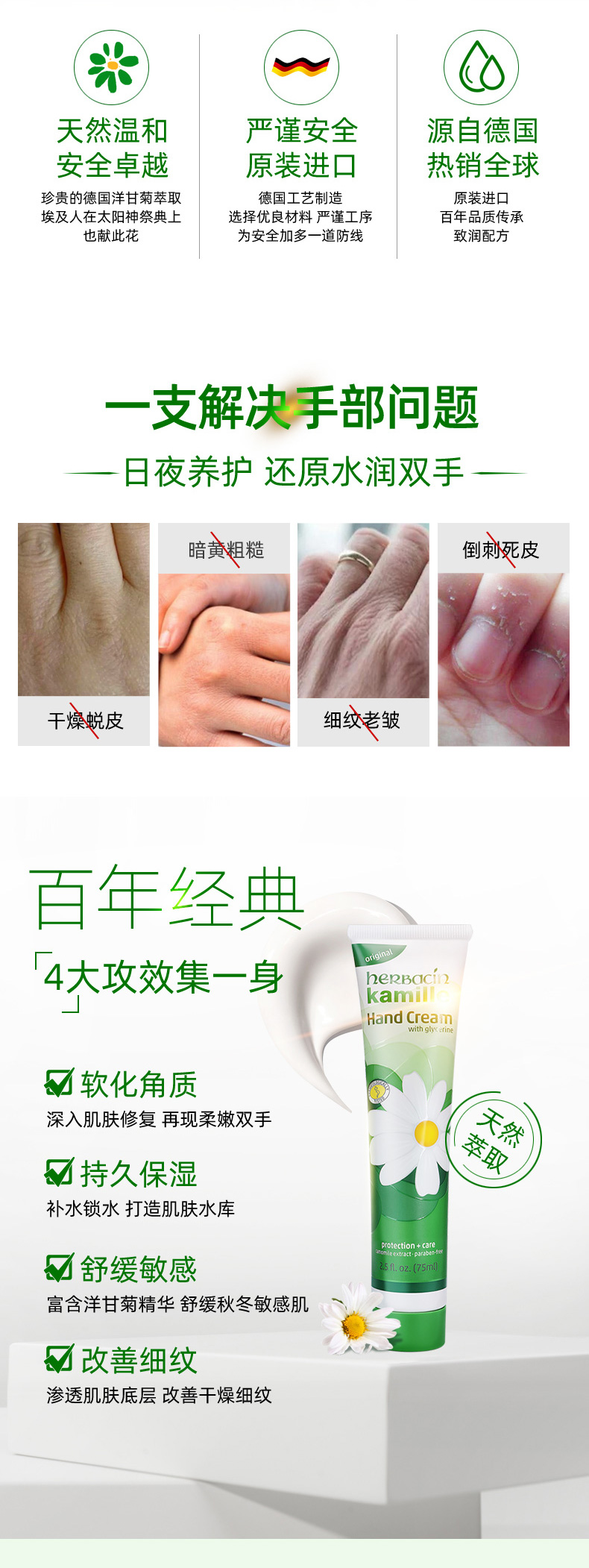 这款小甘菊 补水滋润手足霜,德国原装进口,采用德国洋甘菊萃取精华和荷荷巴油,能软化角质深入修护肌肤,补水持久保湿,洋甘菊精华能舒缓秋冬敏感肌。