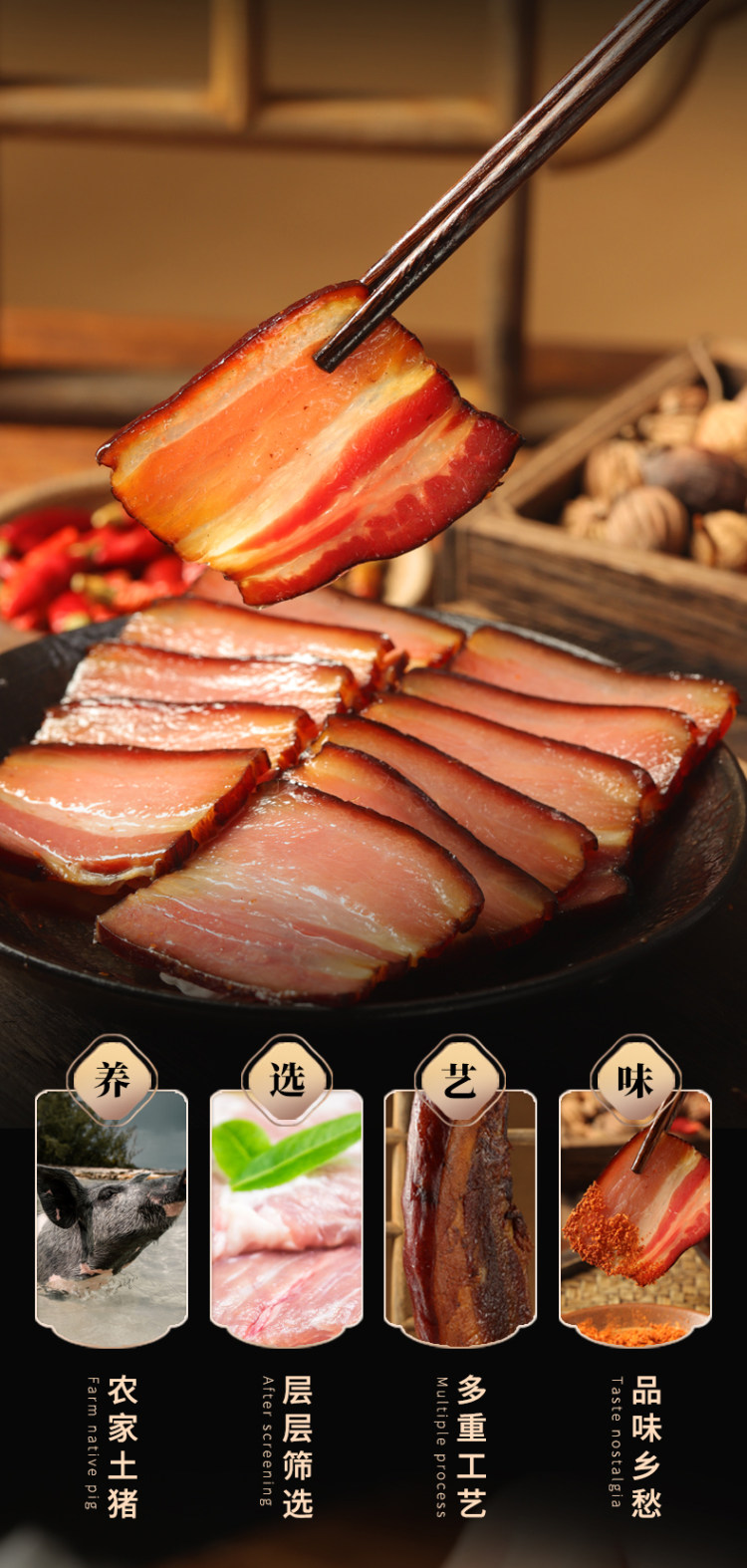 精选优质肉源,一口满嘴香,终日自难忘,咸鲜入味,肥而不腻,带着烟熏味的鲜香味道,肉香扑鼻!炒菜下饭,唇齿留香,赠运费险.