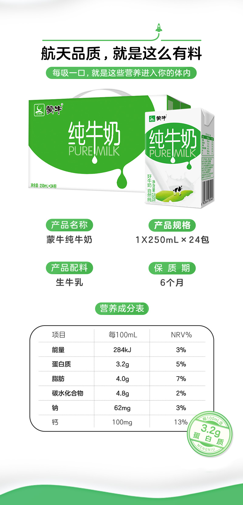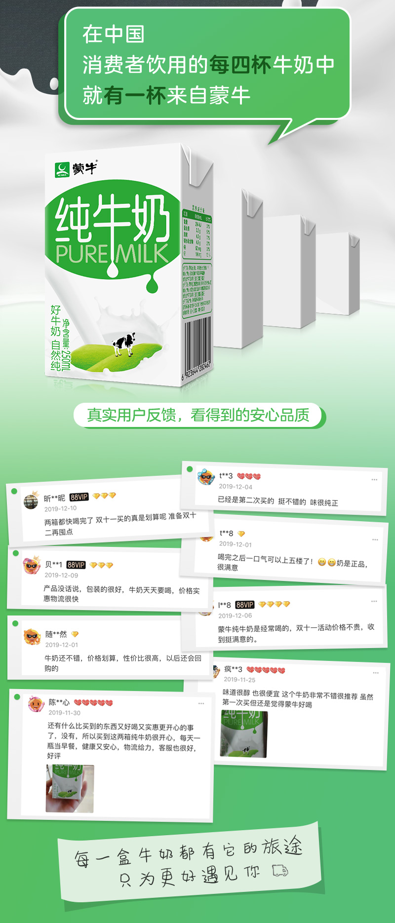 这款蒙牛 全脂纯牛奶,100%生牛乳,放心放肆饮的高标准牛奶,经过精细化管理,运用先进牛奶脱气工艺,脱除不良气味,牛奶不氧化,最大程度保留自然口感。