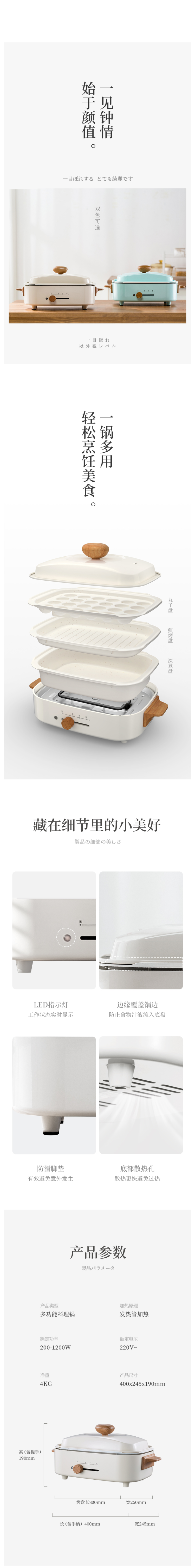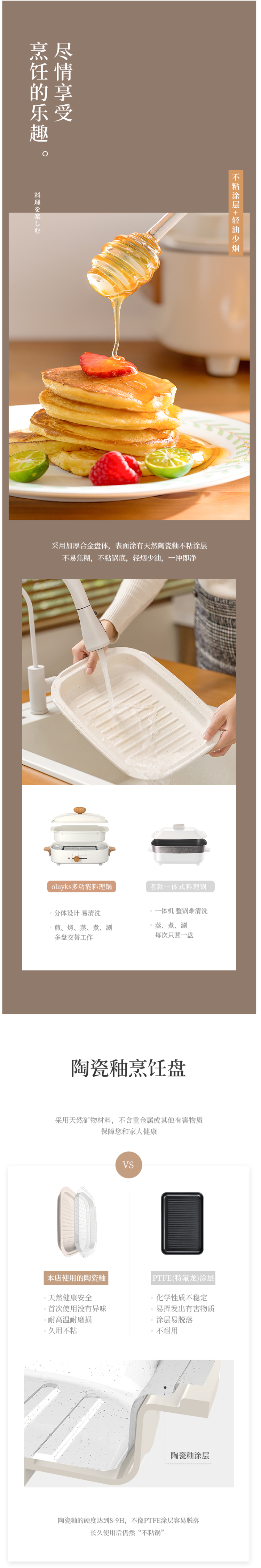机身方形结构设计,分体设计,锅身、锅体都可分拆清洗。锅身是陶瓷釉,使用天然矿物材料制成,不含重金属或其他有害物质,首次使用时没有异味,耐高温、耐磨损。