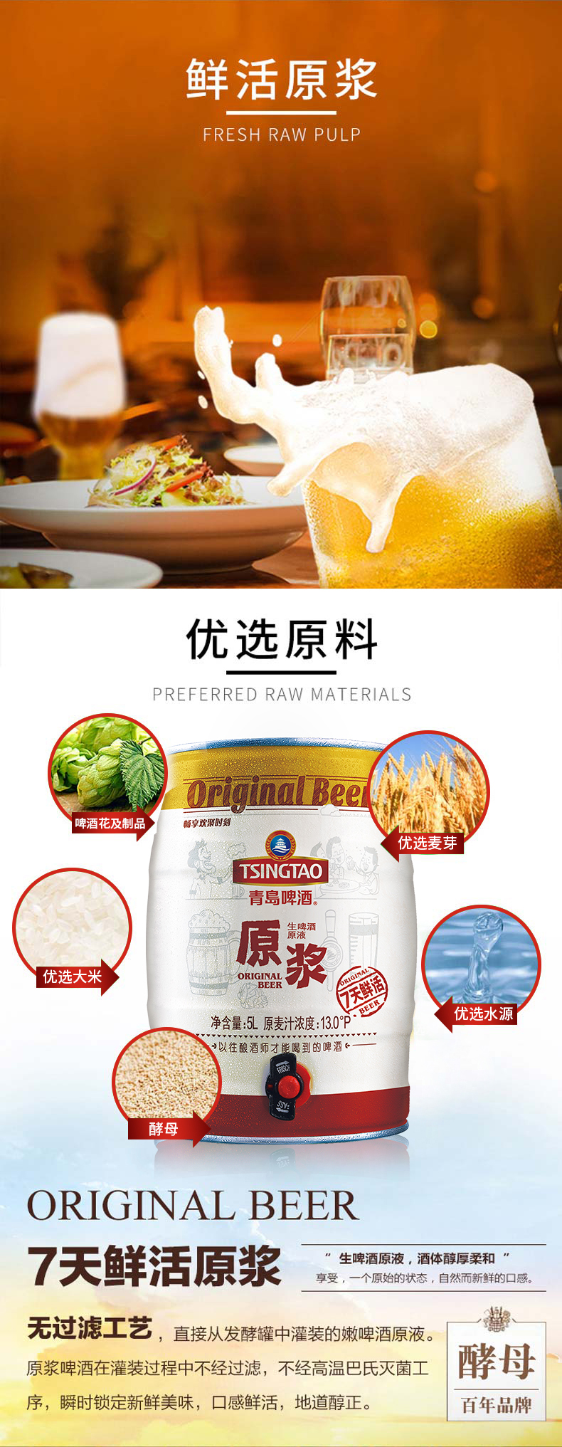 这款青岛原浆啤酒,产地是山东青岛,选用水、麦芽、大米、酵母、啤酒花为原料制成的7天鲜活原浆,就是直接从发酵罐中罐装的嫩啤酒原液,不经过过滤、高温巴氏灭菌,彻底的锁定新鲜美味,口感鲜活纯正。