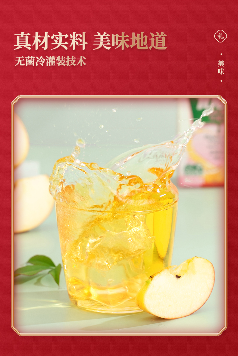 采用无菌冷罐装技术,经过UHT瞬时杀菌,以25℃的冷罐装,更好的保留了果汁的营养、色泽和美味。外包装采用具有阻氧、避光、密封性能强的纸、铝、塑等7层复合无菌包装,有效阻挡阳光,避免果汁氧化。