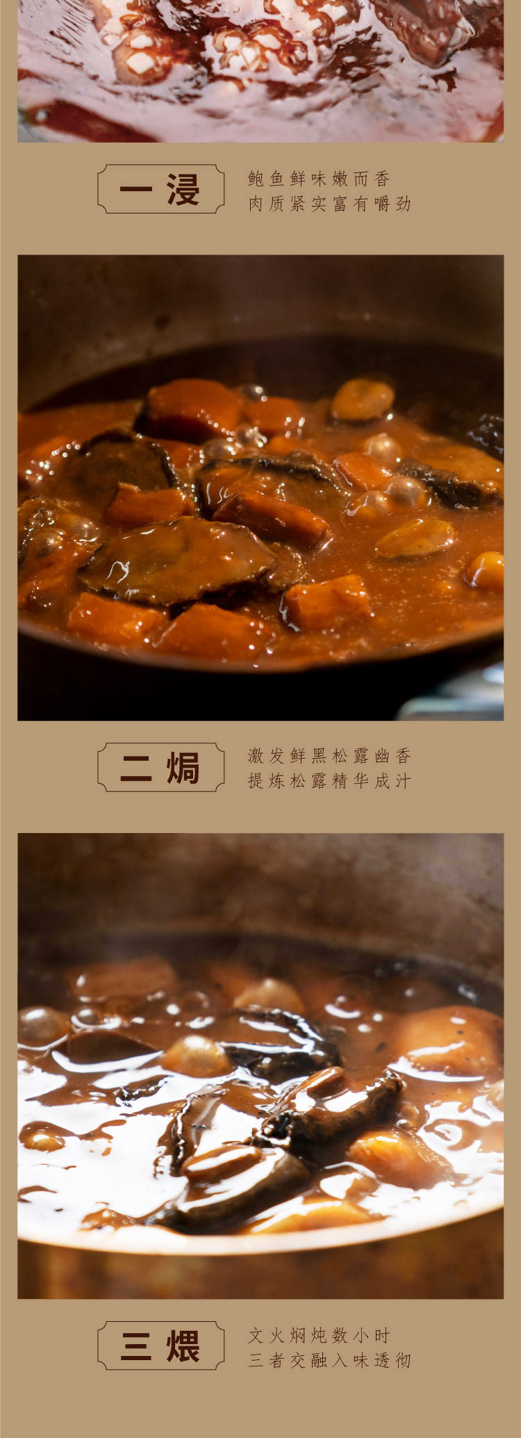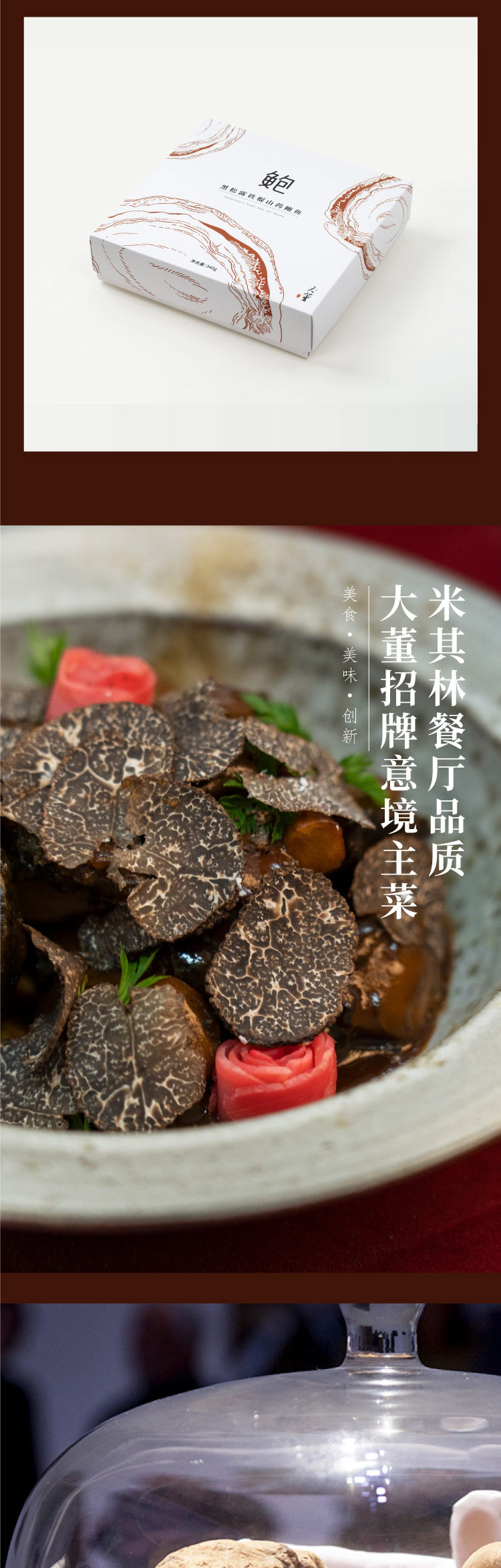这款黑松露铁棍山药鲍鱼是大董的创意招牌菜之一,优选阿尔巴黑松露,精挑细选12头鲜鲍鱼,以及正宗的铁棍山药。一浸、鲍鱼鲜味嫩而香,肉质紧实富有较近;二焗、激发黑松露的幽香;三煨、文火焖炖数小时,三者交融入味透彻,是一款高端创意菜。