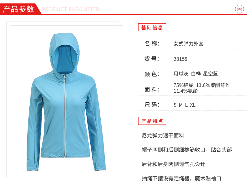 这款连帽外套是锦纶+聚酯混纺而成,耐穿速干透气,拥有四向弹力,后身还有透气孔。