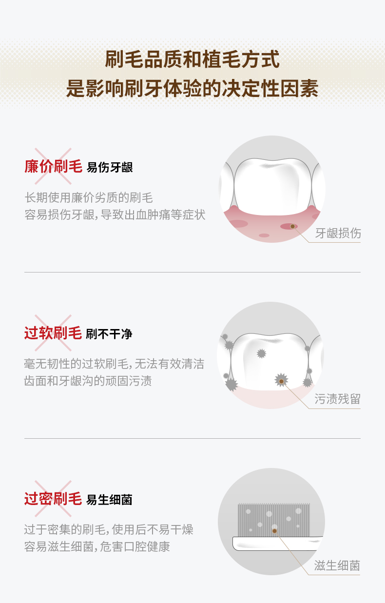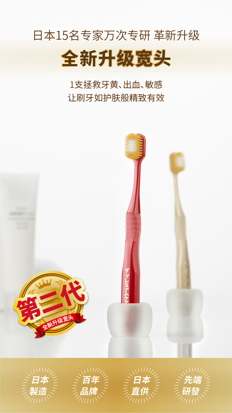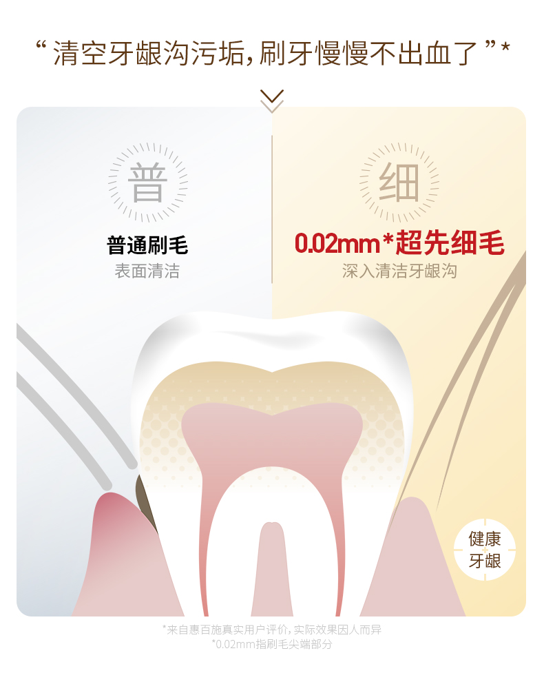 这款牙刷是第2代升级款,革新加宽设计,宽幅65孔8列组合牙刷,清洁面25%UP,由三层不同柔软度的高密刷毛组成,全方位满足洁齿护齿需求,超纤细仅有0.02mm,能深入清洁牙龈沟,有效避免牙龈出血、红肿、敏感等问题,同时具有亮白、洁龈、按摩的作用。