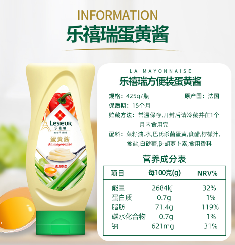 这款乐禧瑞Lesieur蛋黄酱,法国进口,严选新鲜鸡蛋、新鲜植物油,如奶油般的质地,口感浓郁香醇,欧盟认证,非转基因,可搭配三明治汉堡、沙拉,薯条,拌面等。
