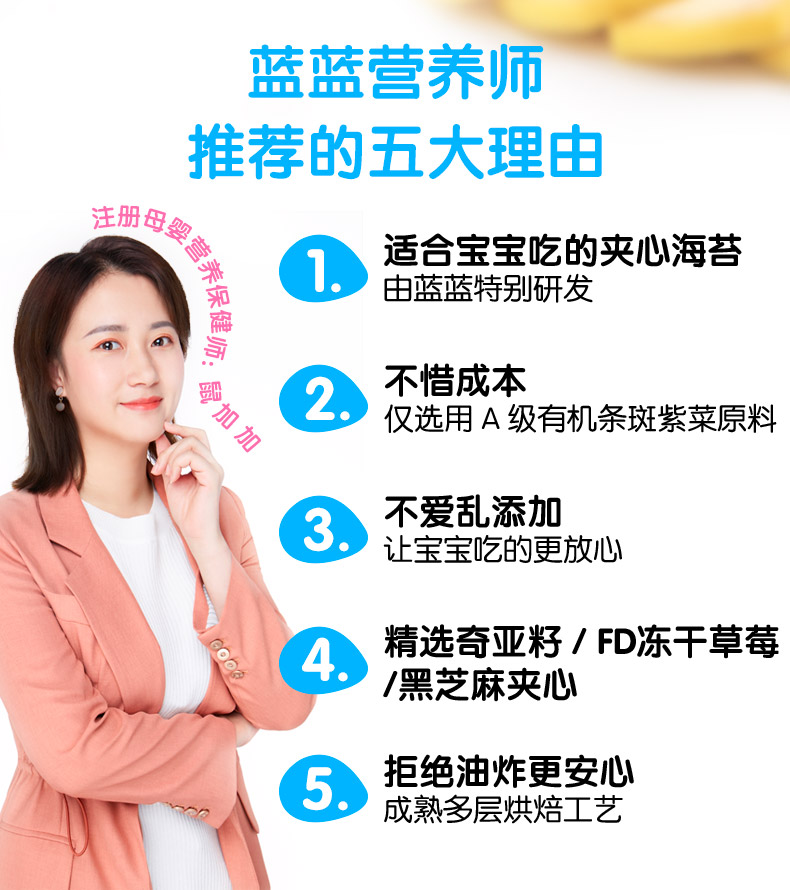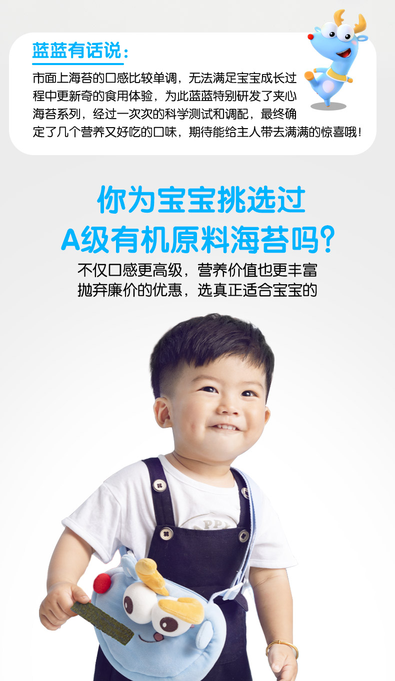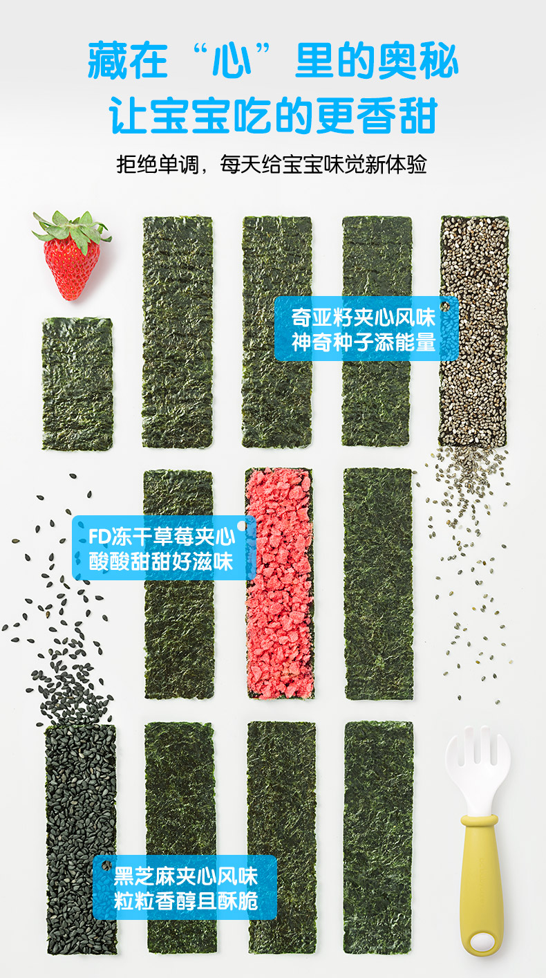 这款小鹿蓝蓝 草莓/奇亚籽/黑芝麻 海苔夹心脆,只使用A级有机条斑紫菜,精选奇亚籽/FD冻干草莓/黑芝麻作为夹心,0添加,拒绝油炸,多层烘焙工艺更安心。