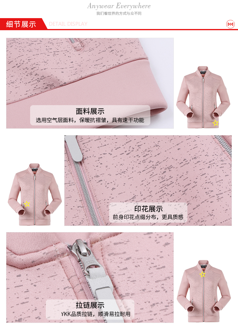 这款地球科学家女弹力休闲外套,采用最近非常流行的空气层面料,主要组成是92.4%聚酯+7.6%氨纶弹性纤维,特殊的三明治结构,更易锁住空气,能起到保暖锁温、速干抗褶皱的作用,适合春秋季节穿。