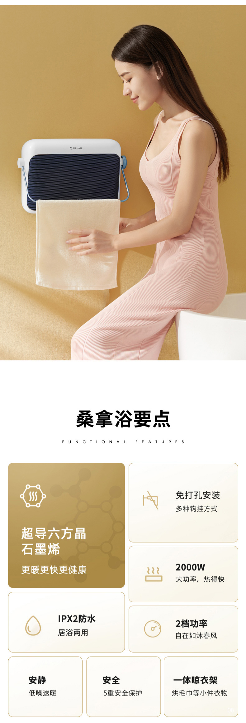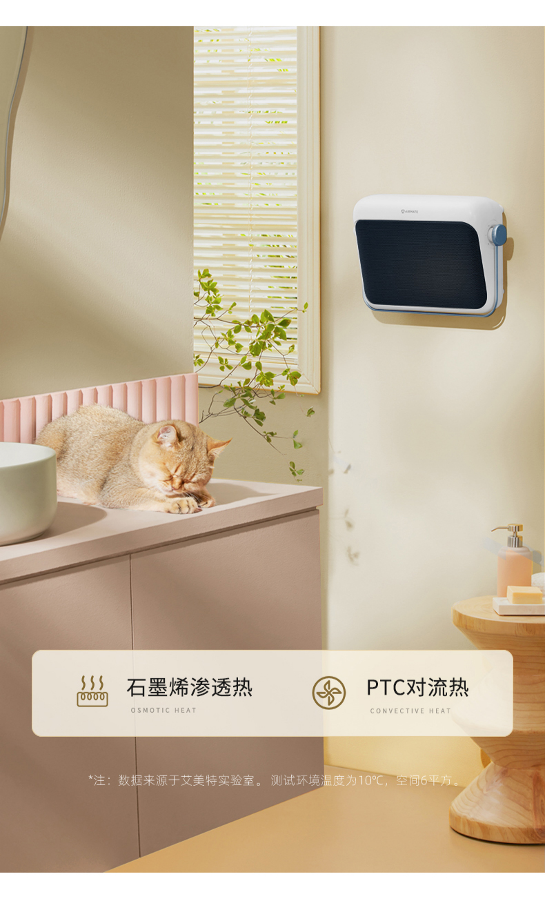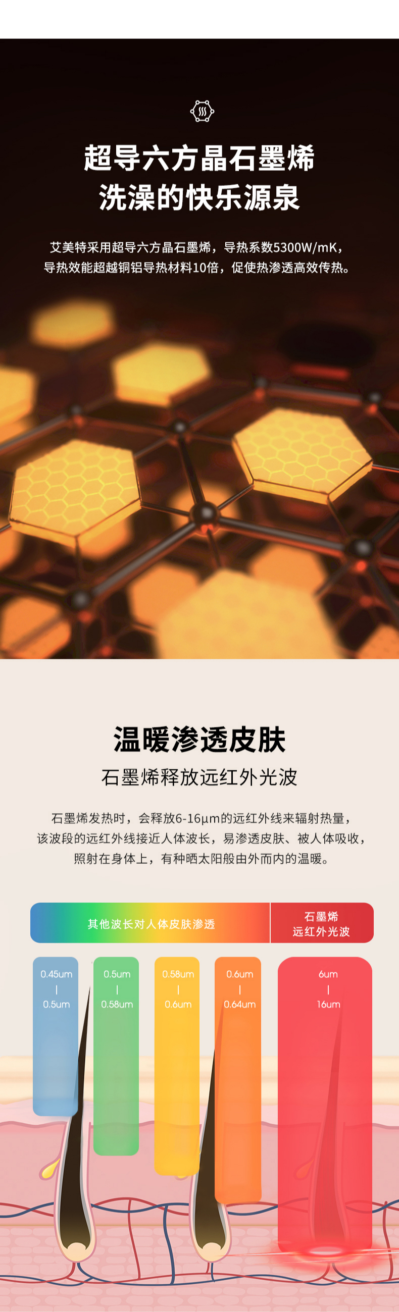 发热体采用TPC+新型六方晶石墨烯的复合发热,新型六方晶石墨烯导热系数5300W/mk,效能超越铜铝10倍以上,三秒速热取暖更高效,同时释放远红外光波温暖渗透肌肤,无光、无色、无氧耗、有种晒太阳般由外而内的温暖,