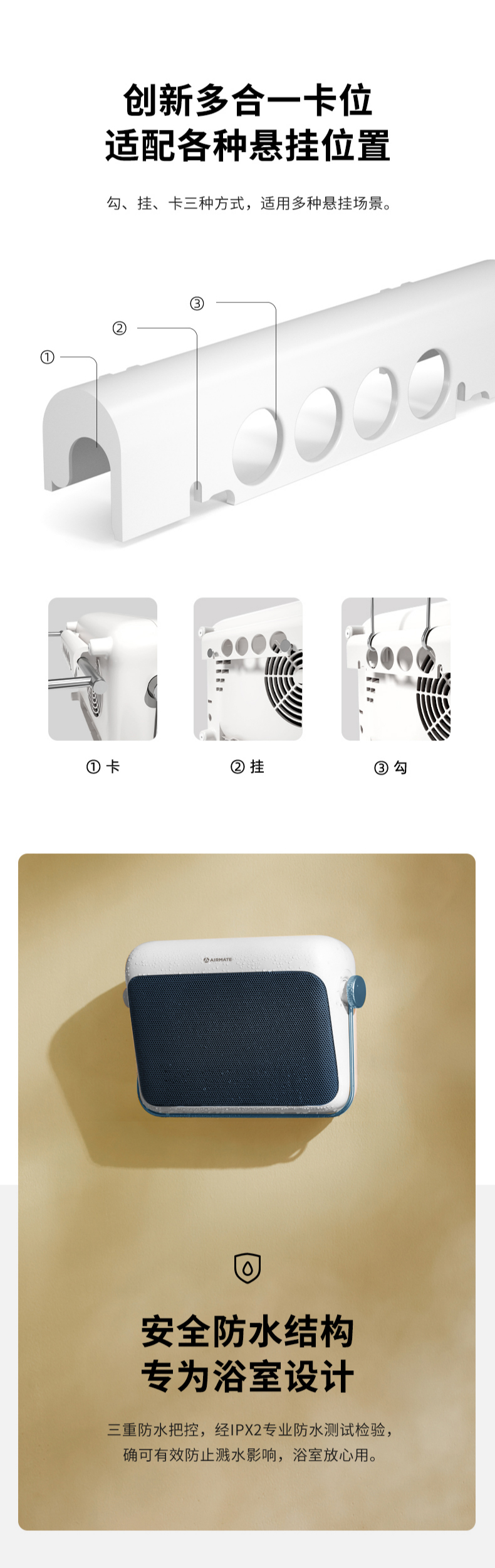 细节上:离心风轮升级,优化风道,增大聚风能力,风力风速不变,转速降低,减少机械摩擦,低噪更安静,IPX2防水,15°泄水结构,内部电器元件密封防水、防水开关等设计,为浴室使用提供安全保障。