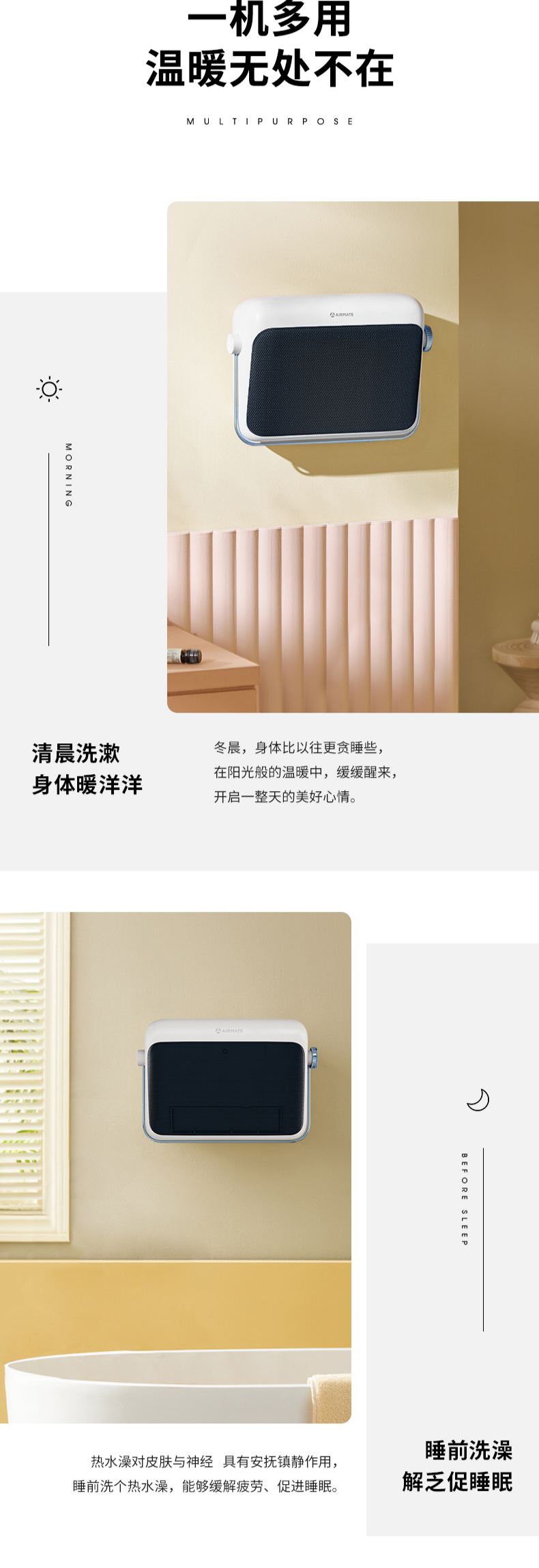 这款艾美特 暖风机,1200w适温、2000w高温,2档可调,可居浴两用,可台、地、壁挂、多种使用方式,免打孔不伤墙面,创新多合一卡位,勾、挂、卡三种方式,适用多种悬挂场景。