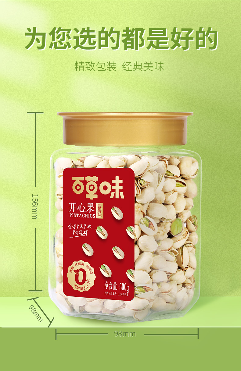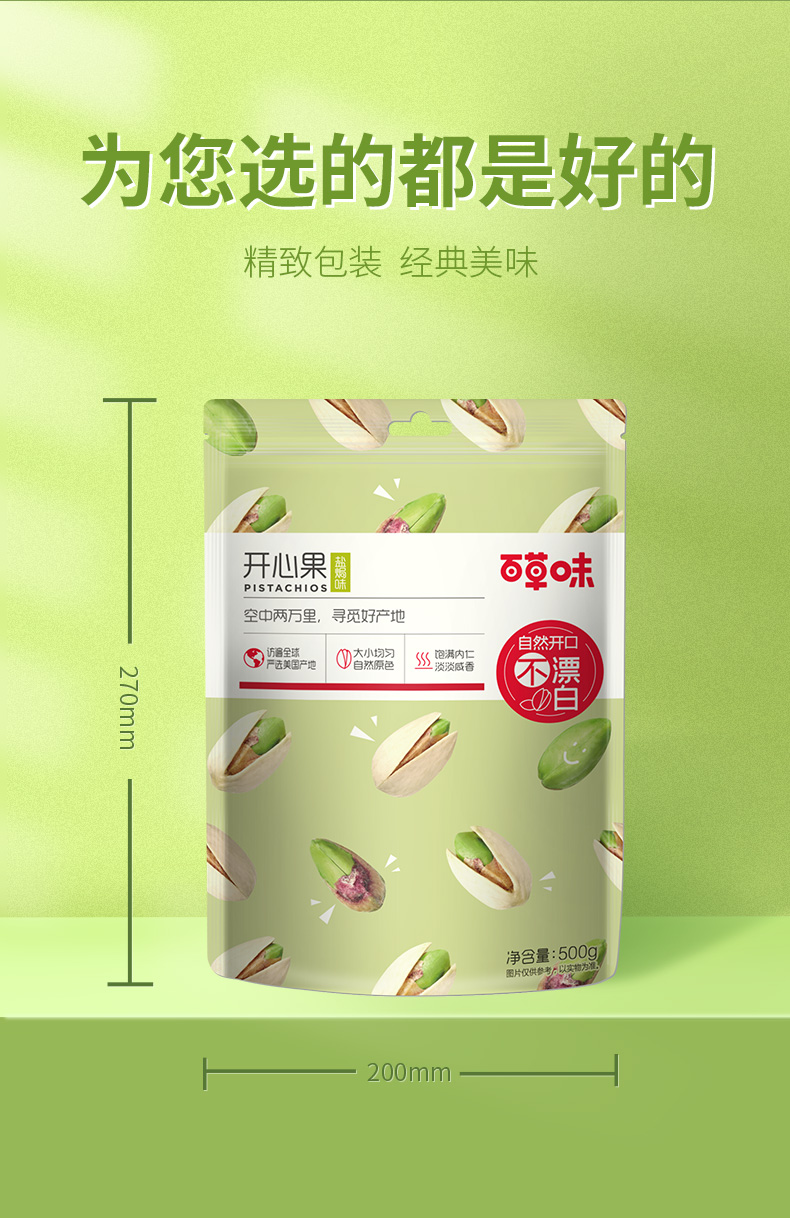 开心果是一种大家都很喜欢吃的坚果, 这款百草味 原味无漂白开心果,原果来自美国加州,果实自然成熟开口,果肉饱满、大小均匀、经典原味,酥脆微软,没有经过漂白,可健康食用。