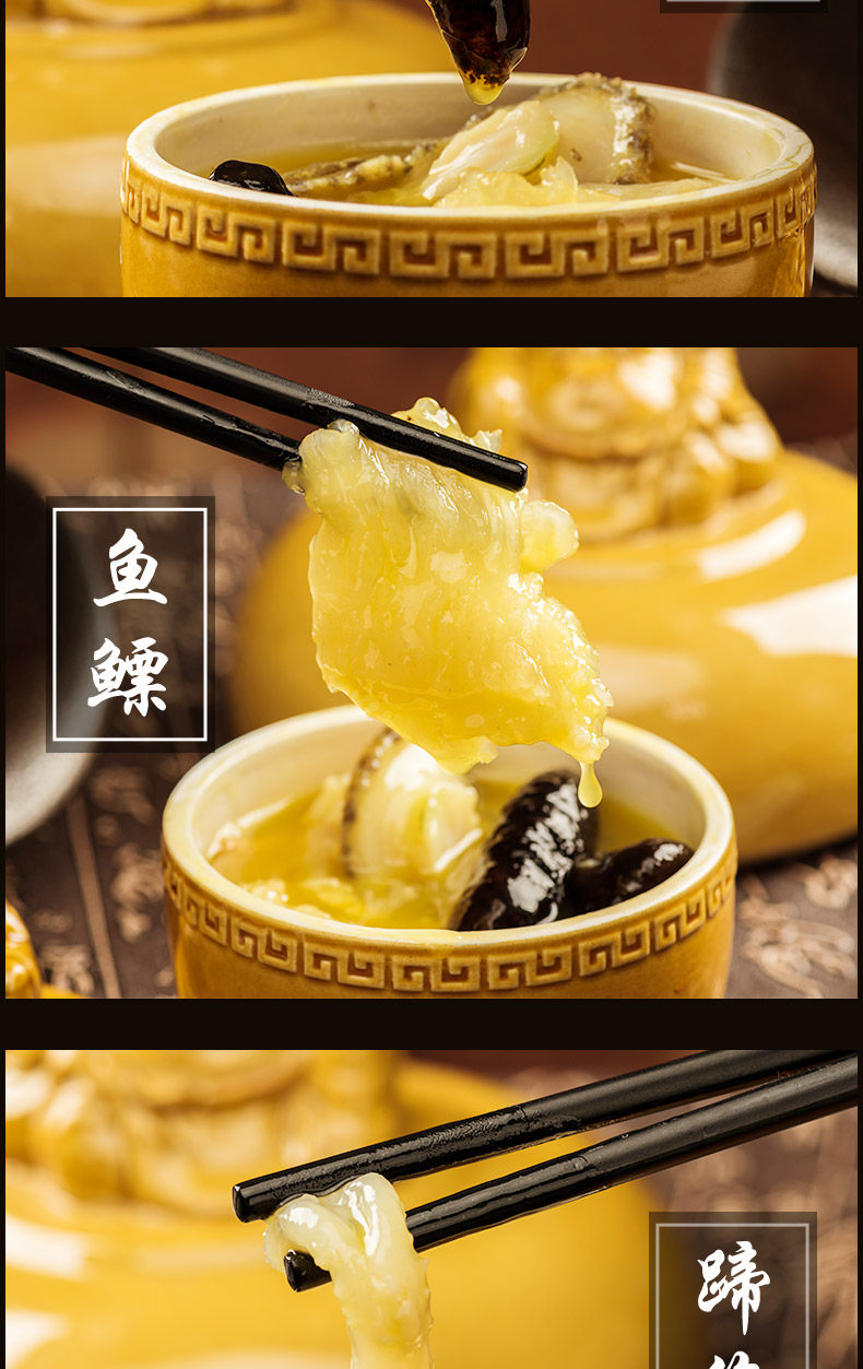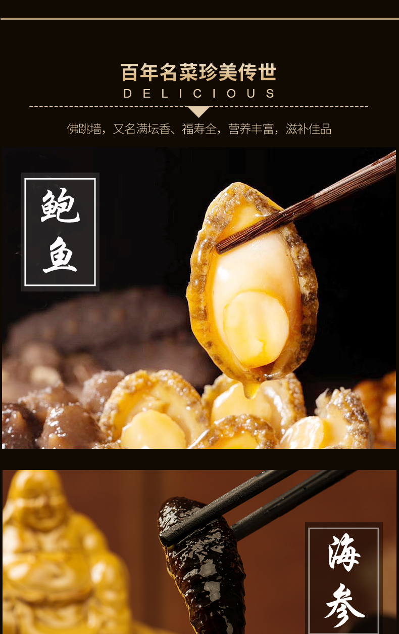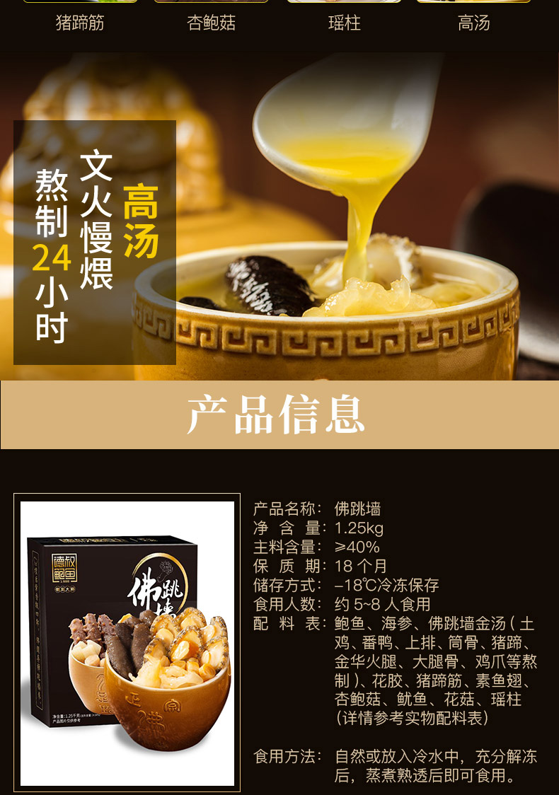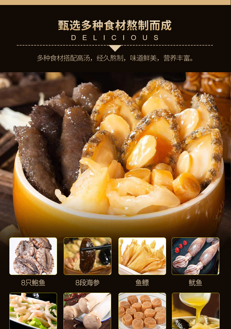 这款佛跳墙全新升级固形物含量增加了6%,8只鲍鱼、8段海参、鱼鳔、柔鱼、猪蹄筋、螺肉、香菇、杏鲍菇等多种高端食材。谨遵古法高汤熬制,配以土鸡、鸭肉、猪肉等多种食材交替分层煨制24个小时,汤底富胶质,香浓艳滑,味道醇厚。不含任何防腐剂成分。买回家加热即食即可,非常方便。