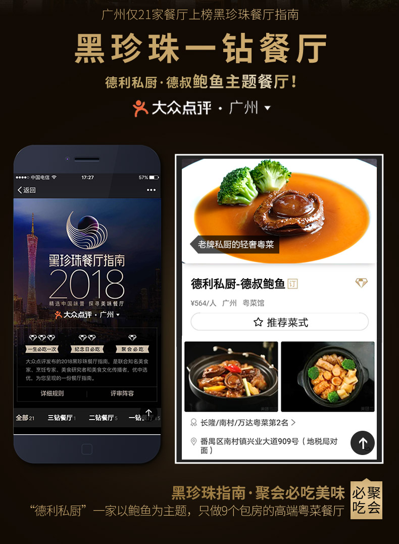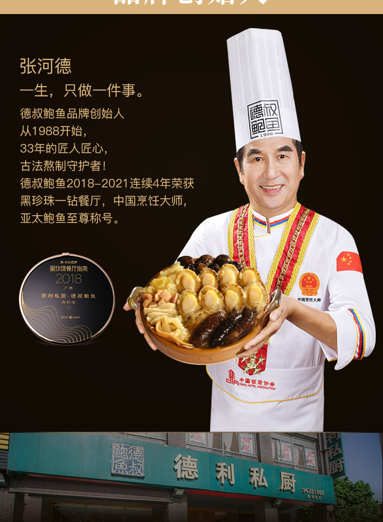 德叔餐厅是2018-2020年大众点评黑珍珠餐厅的一钻餐厅,广州只有21家餐厅上榜,被誉为“国内的米其林指南”。品牌创始人张河德,从1988年开始32年专注鲍鱼匠心制作,荣获“中国烹饪大师”“亚太鲍鱼至尊”称号。