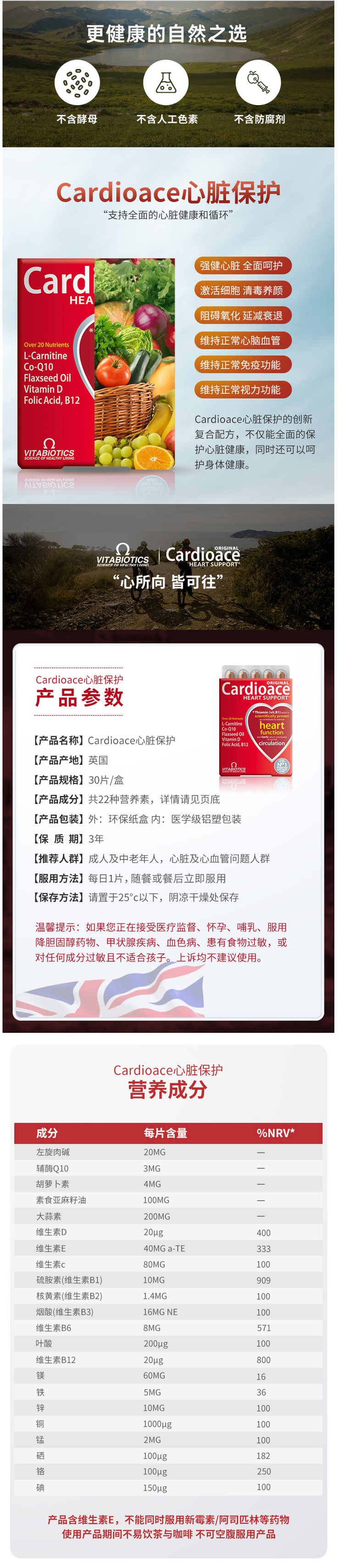 这款维百莱旗下Cardioace辅酶Q10,英国原装进口,使用复合配方,全方面呵护心脏。主要成分是辅酶Q10、植物亚麻籽油、大蒜素、镁、硫胺素、维生素B6、维生素B12、叶酸等22种营养元素,除了呵护心脏,同时呵护全身健康。