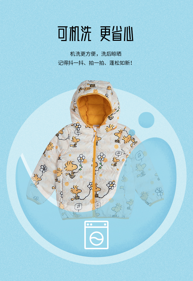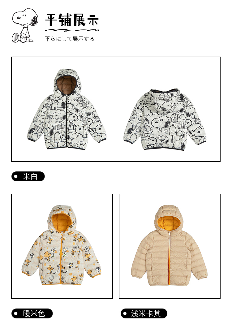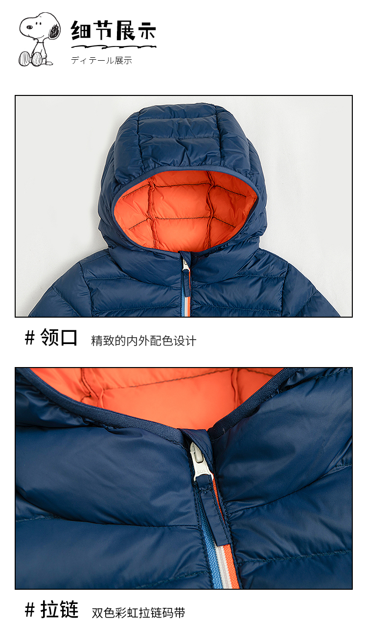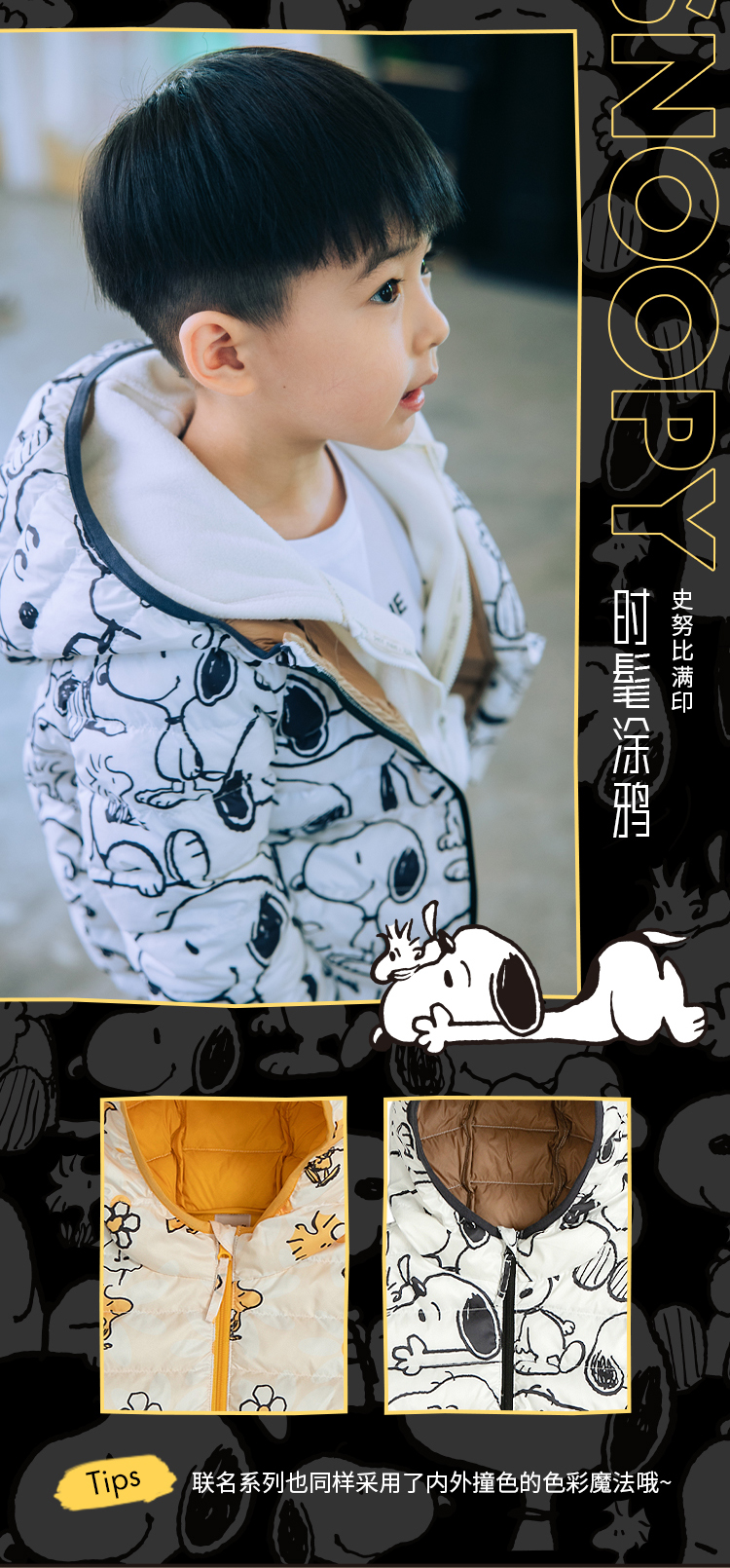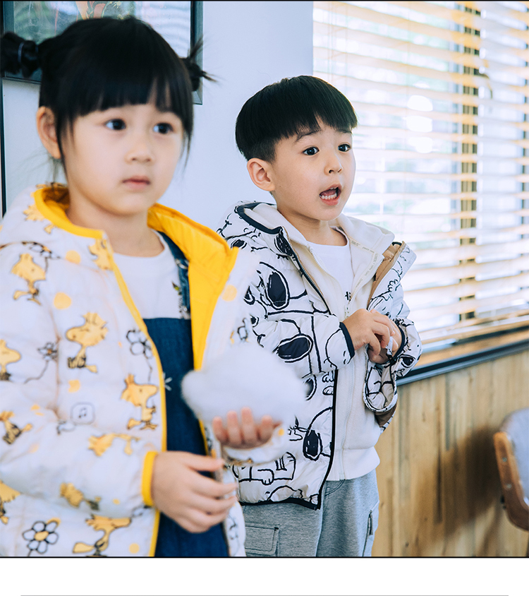 这款史努比联名款羽绒服,时尚涂鸦,充满童趣,甄选大绒朵90白鸭绒,外层480T高密度面料,防风防泼水,专业防钻绒技术,分格充绒,充绒均匀,充绒量相,比普通款赠加了34%由原来38.8g增加到52.1g,保暖性更好,自由防风连帽和高领,能有效呵护头部、颈部,品质拉链长久拉合顺滑不卡顿品。