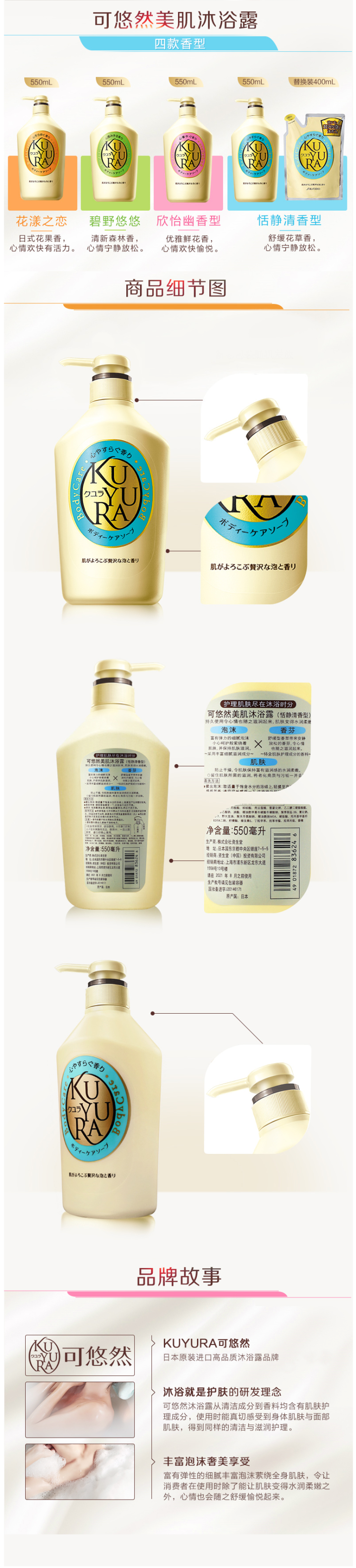 可悠然KUYURA,是资生堂集团旗下的原装进口沐浴露品牌,创立于2008年,含有肌肤护理成分的香芬及泡沫萦绕全身并清洁肌肤,让身体肌肤拥有与面部肌肤同等级别的护理。