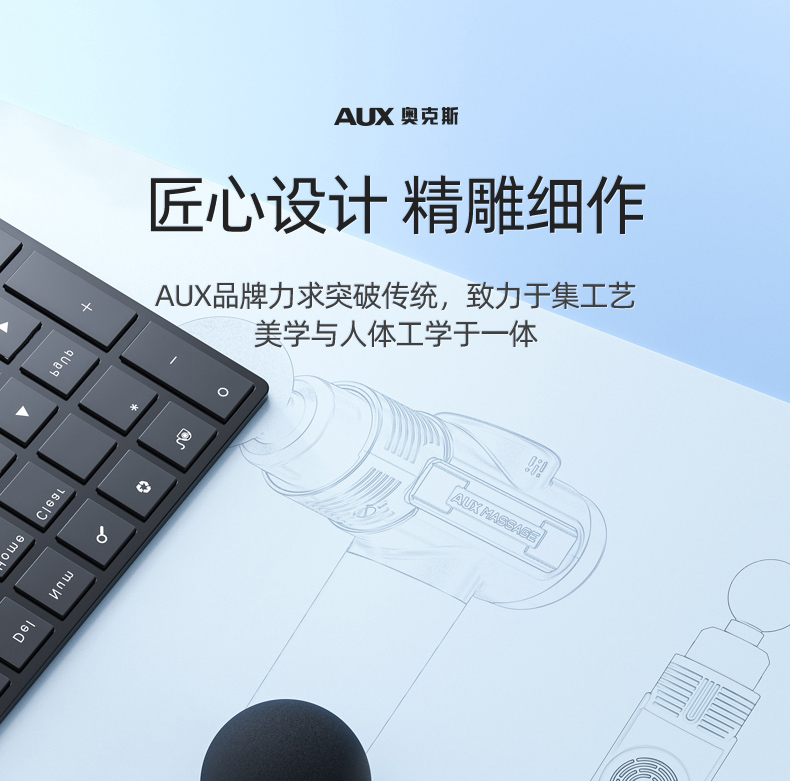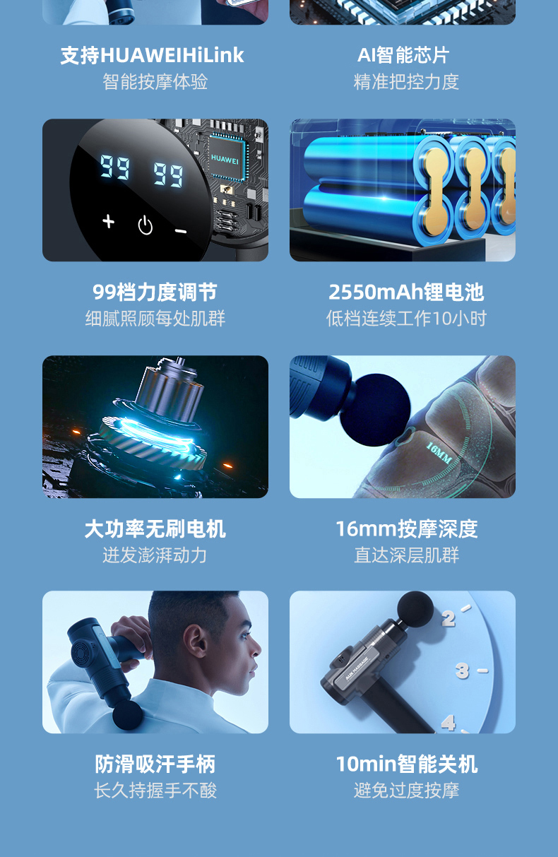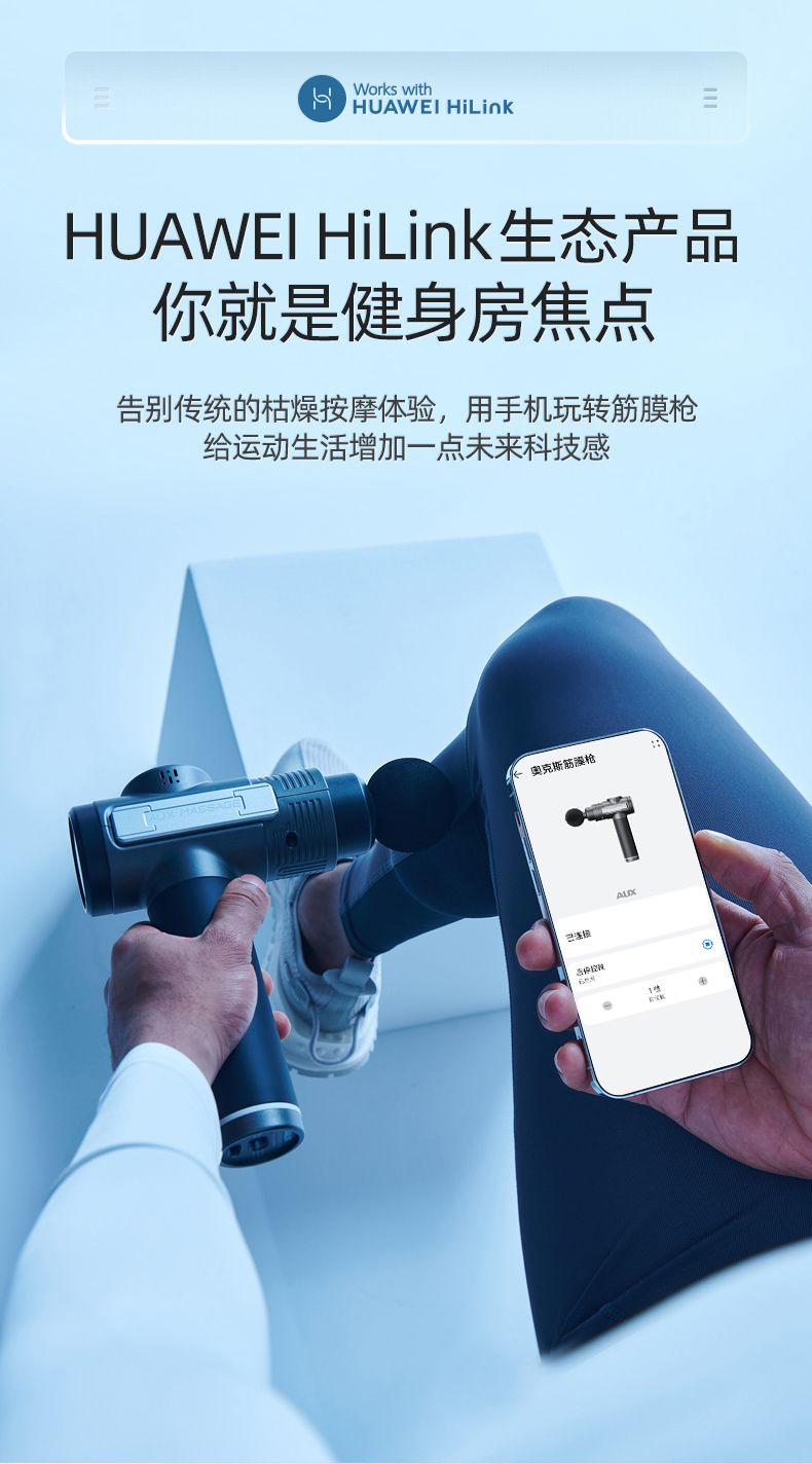 这款AUX 奥克斯 筋膜枪,进口智能AI芯片,搭载华为HiLink智控科技,采用黑科技降噪的大功率电机,以及顺畅的联动组件,让强大的扭矩动力直击肌肉处筋膜,实现更深层的按摩。液晶屏灵敏触控,99档力度调节,16mm按摩深度,6+2专业按摩头配置,全身针对性靶向按摩。防滑吸汗手柄,10分钟智能关机。大功率无刷电机,2550毫安长效储能锂电池,低档10小时持久续航。