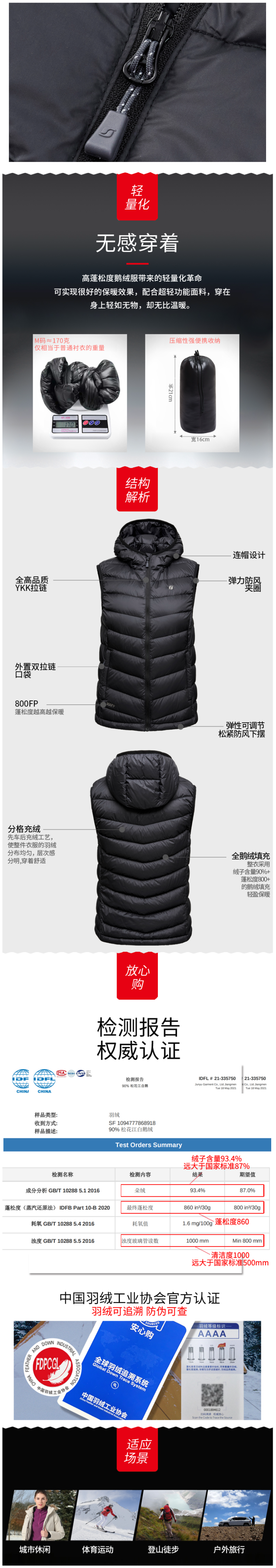 「鹅绒」800蓬鹅绒成本约是普通鸭绒的10倍,没有鸭毛的腥味,保暖效果更好:「56克 800蓬鹅绒」≈「74克 700蓬普通鹅绒」≈「103克普通鸭绒」,可以穿的又轻又暖。