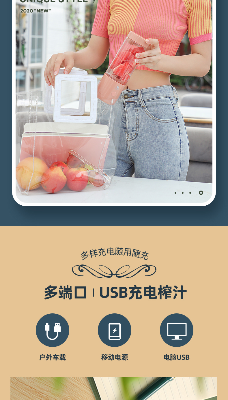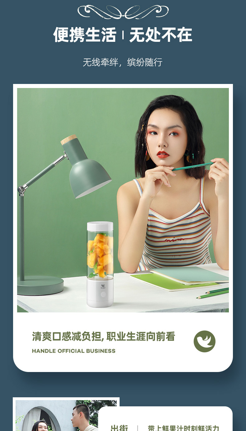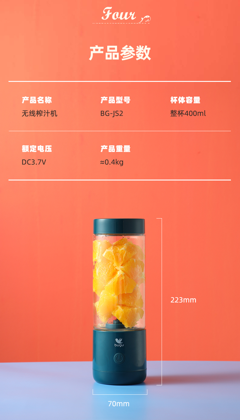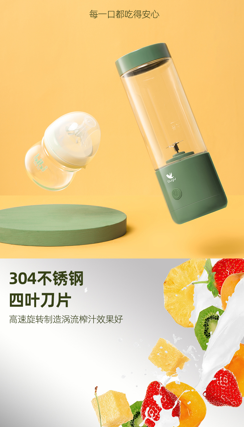 这款便携榨汁机由美的旗下品牌出品,内置食品级304不锈钢刀片,搭配3.7V强扭矩电机,动力更强,快速榨汁。杯壁采用奶瓶常用的食品级塑料,使用过程中无有害物质析出,使用安全。