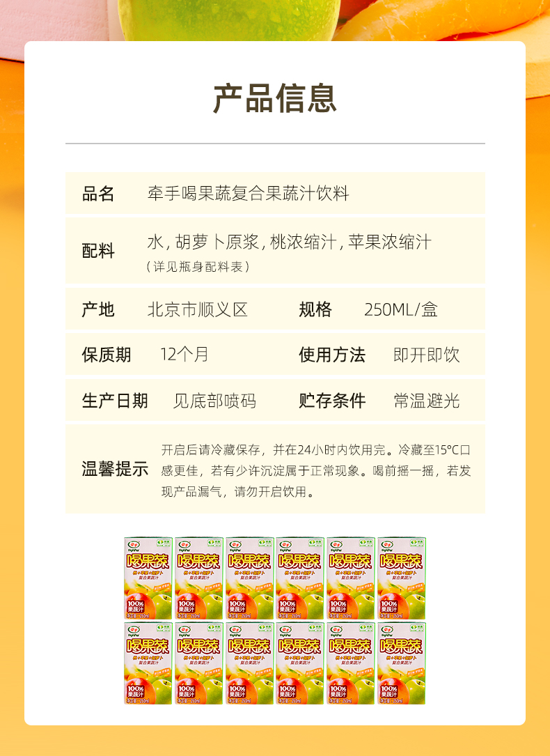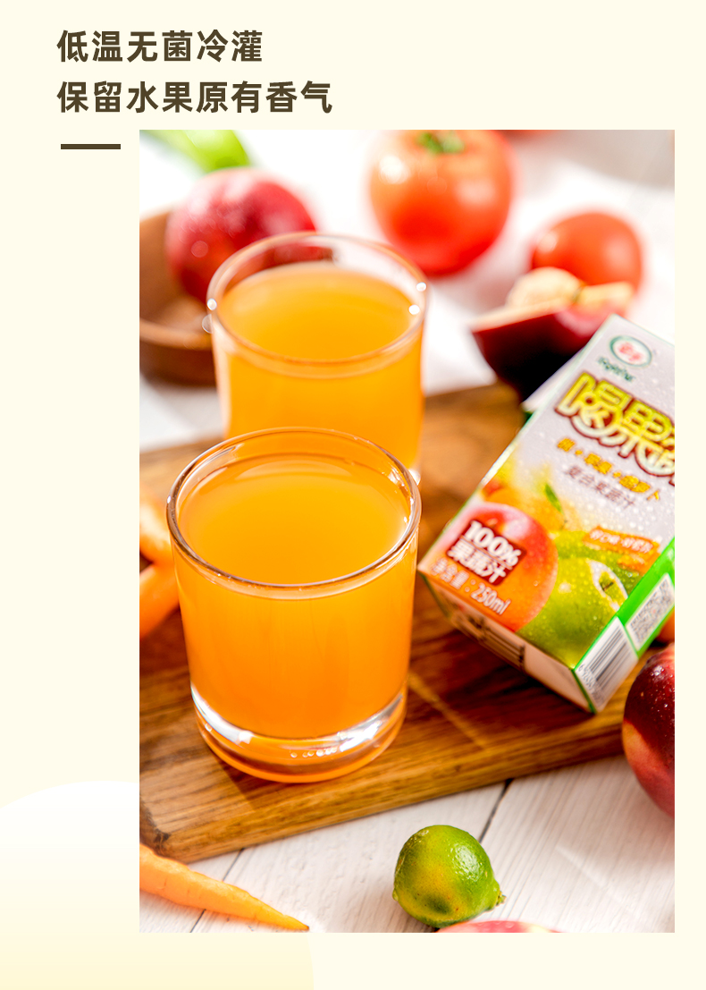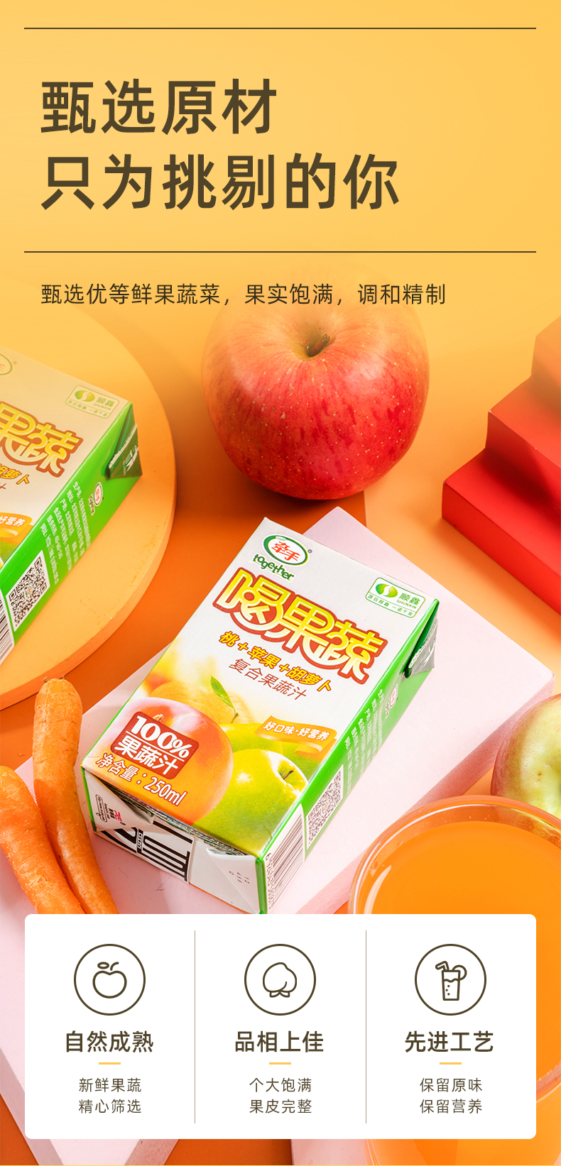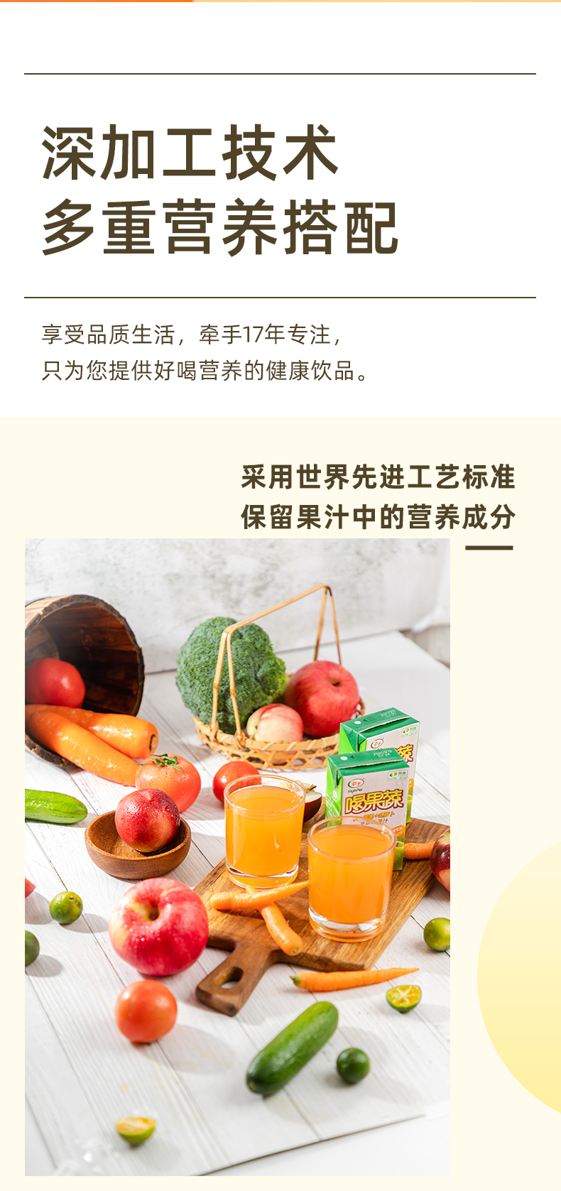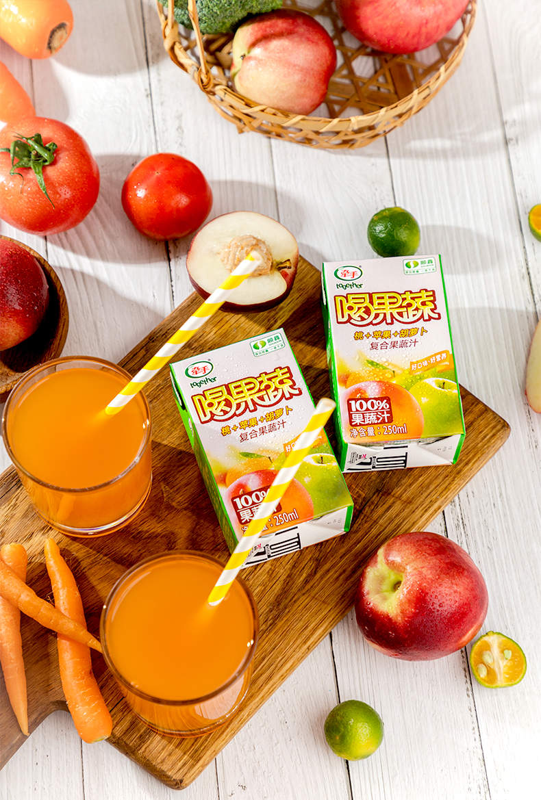 “牵手”果蔬汁口味纯正鲜、成分天然,其创新之处在于以不同风味的适量果汁调配蔬菜口味,引导人们的消费习惯由以往的吃蔬菜、嚼蔬菜变成“喝果蔬”,经过超细微加工的蔬菜汁,能够更加轻松地汲取β+VC的双重营养,是真正的“果蔬营养专家”。